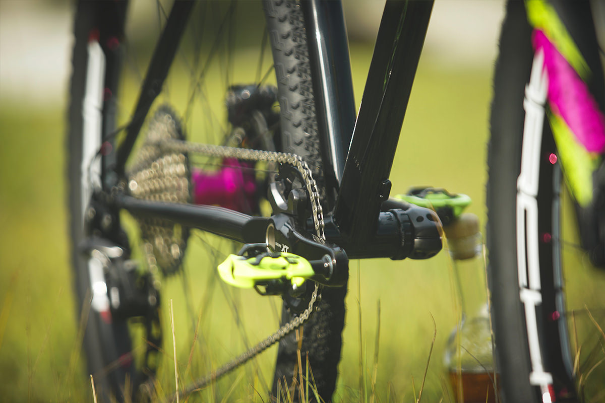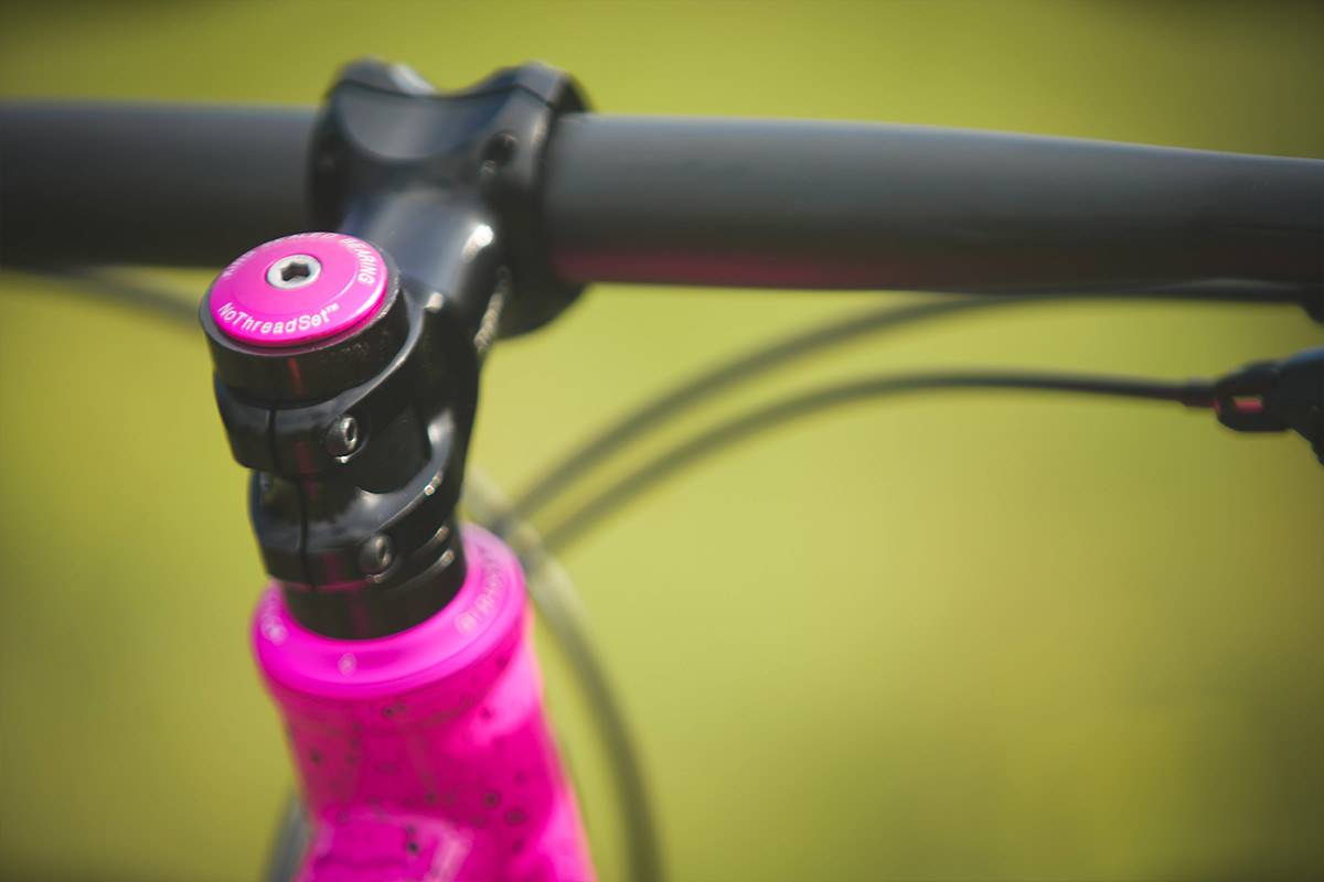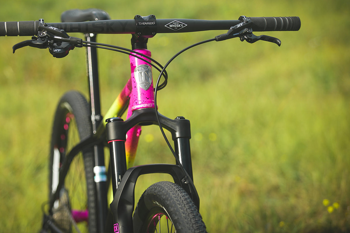 Stuart was originally going to build it up as a single speed but a sudden knee injury laid that plan to rest, so an XT configuration was used instead, along with a Matte Punch pink Chris King headset and hubs, and a Whisky Parts Co flat bar.