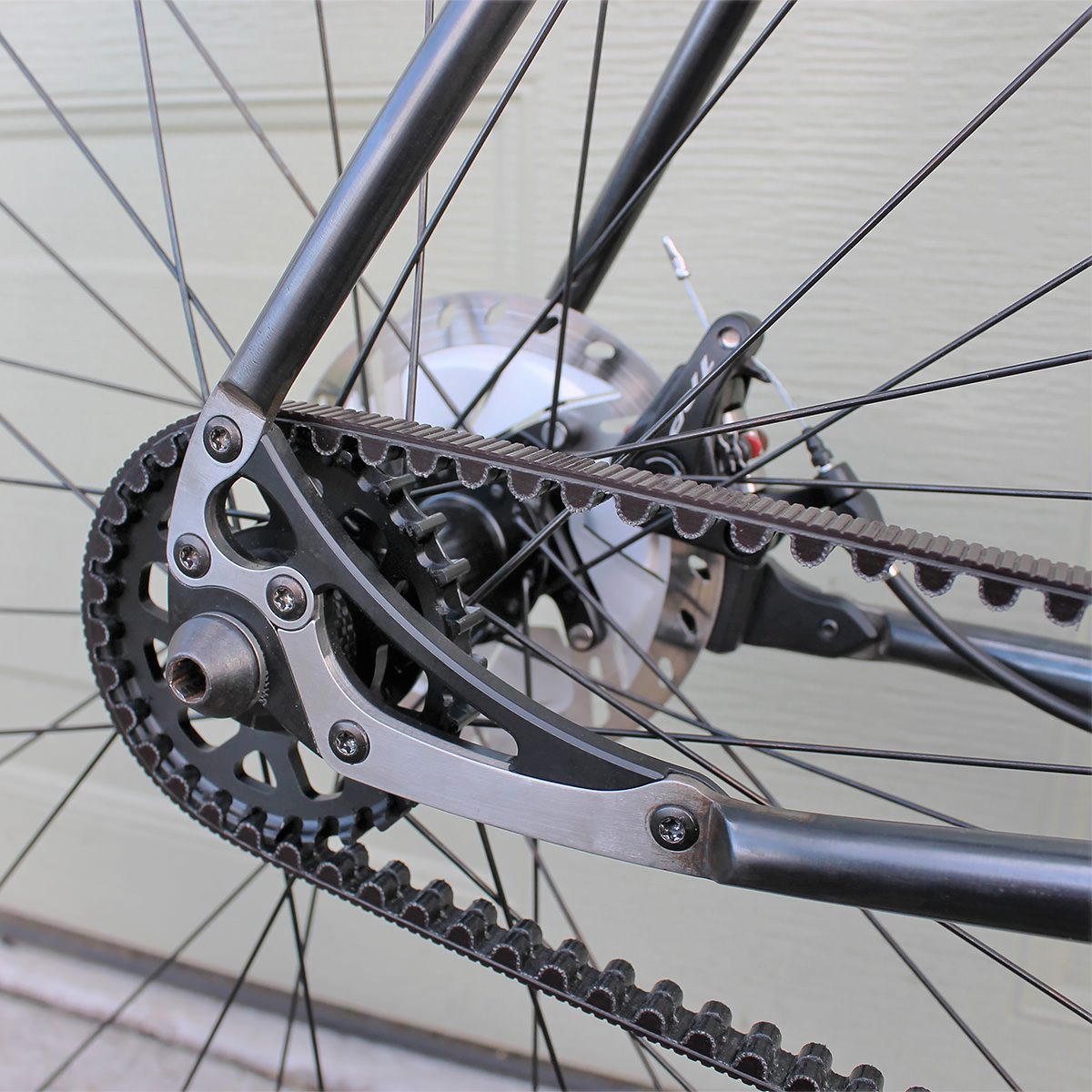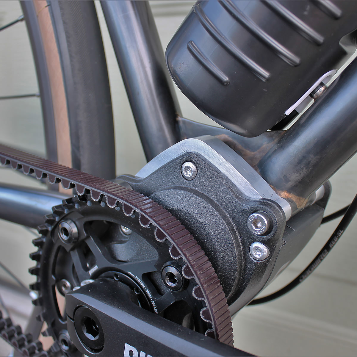 His design fastens the main triangle to the front mounting screws of the gearbox, then affixes a chain stay bridge to the rear, slotted for a few millimetres tension adjustment. Not wanting the gearbox itself to bear any twisting load of these two overlapped subassemblies, an aluminum brace resides between them.