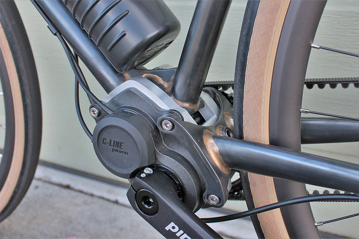 The 295% range is adequate for climbs and descents, but the 24% increments between the six gears — along with the coarse freewheel ratchet at the cranks — “definitely took some getting used to,” he says. Only available with a twist shifter for MTB bars, Dave had to design his own stem mount components to combine with the Pinion parts.