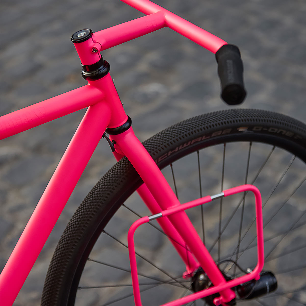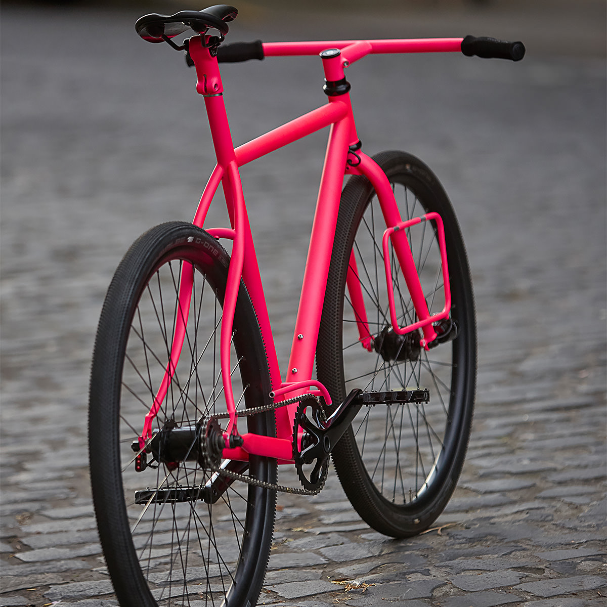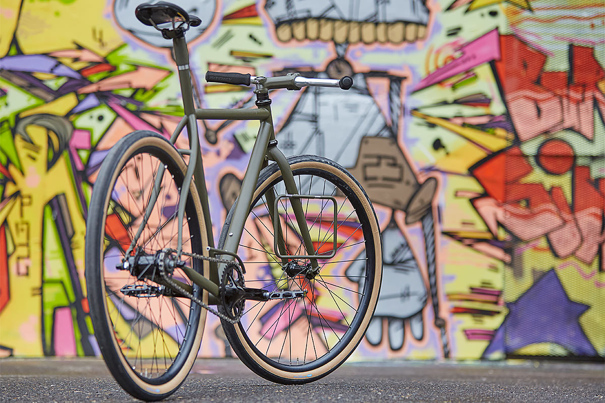 At the heart of the Urban Racer is a SRAM 2 speed Automatix rear hub coaster brake with a custom black finish, paired with a DT Swiss front hub. The drivetrain results in a hella-fun, brash, ’round town street fighter.
