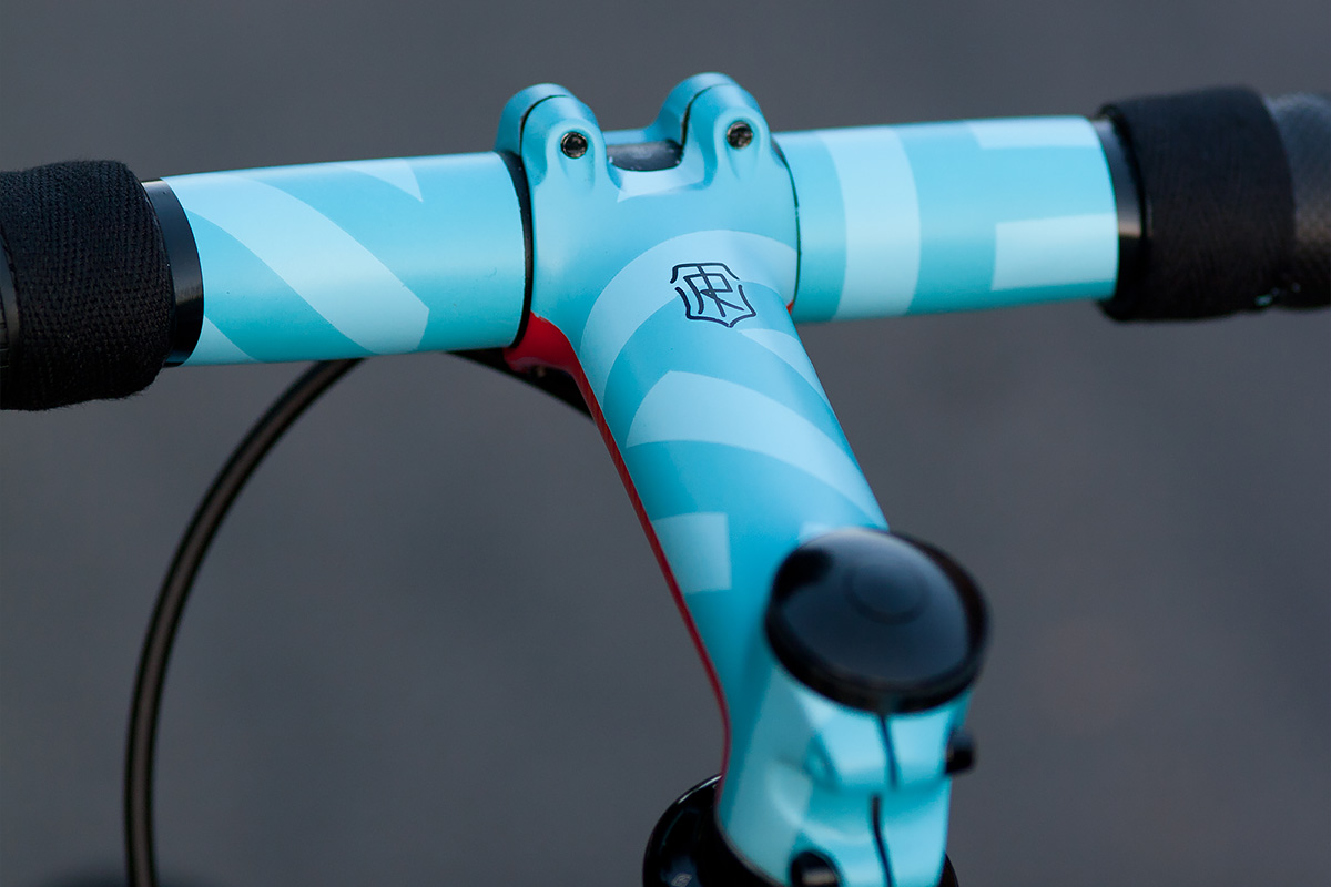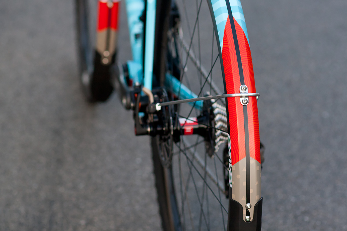 Again, the arresting signature graphic style was applied. The background is a perfect balance of big, bold, baby blue sections and hypnotically intricate red panels. Corporate branding on the rims, frame, handlebars and cockpit has been dispensed with.