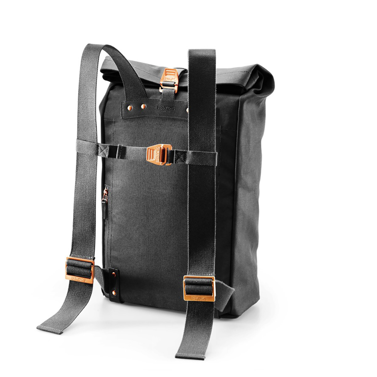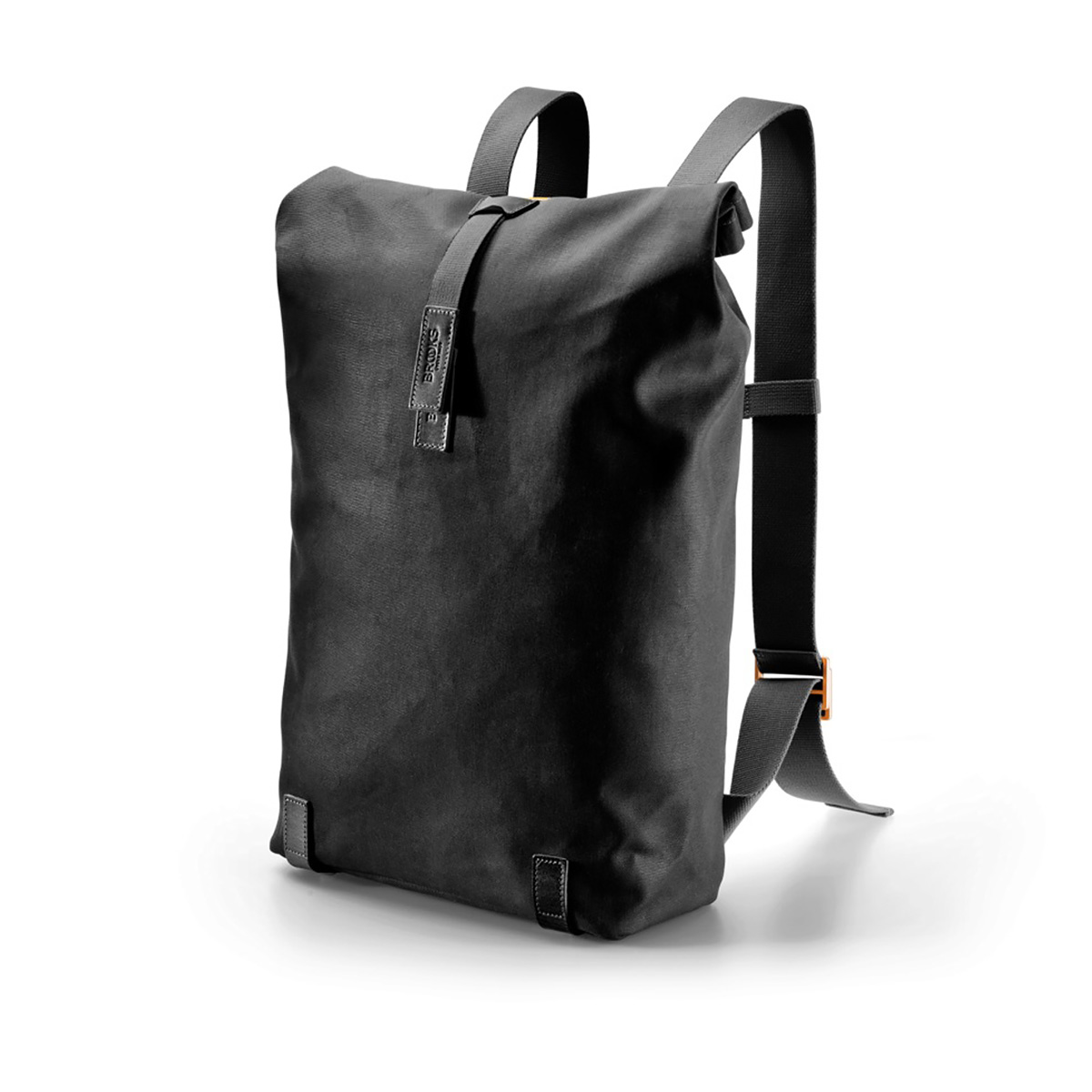 The popular Pickwick Rucksack has been re-imagined in all-black, water-resistant cotton canvas and vegetable-tanned leather details with copper plated buckles and clips.
