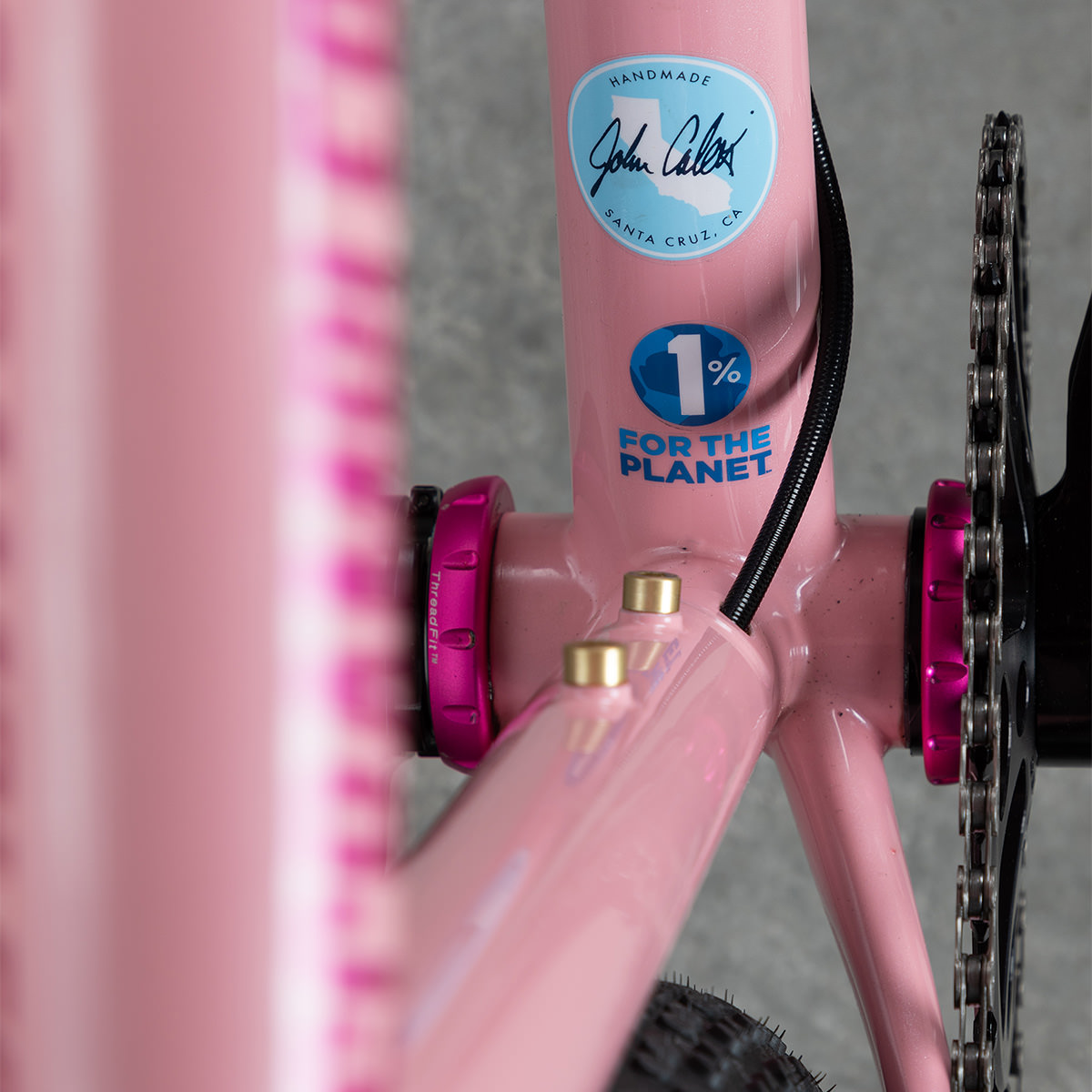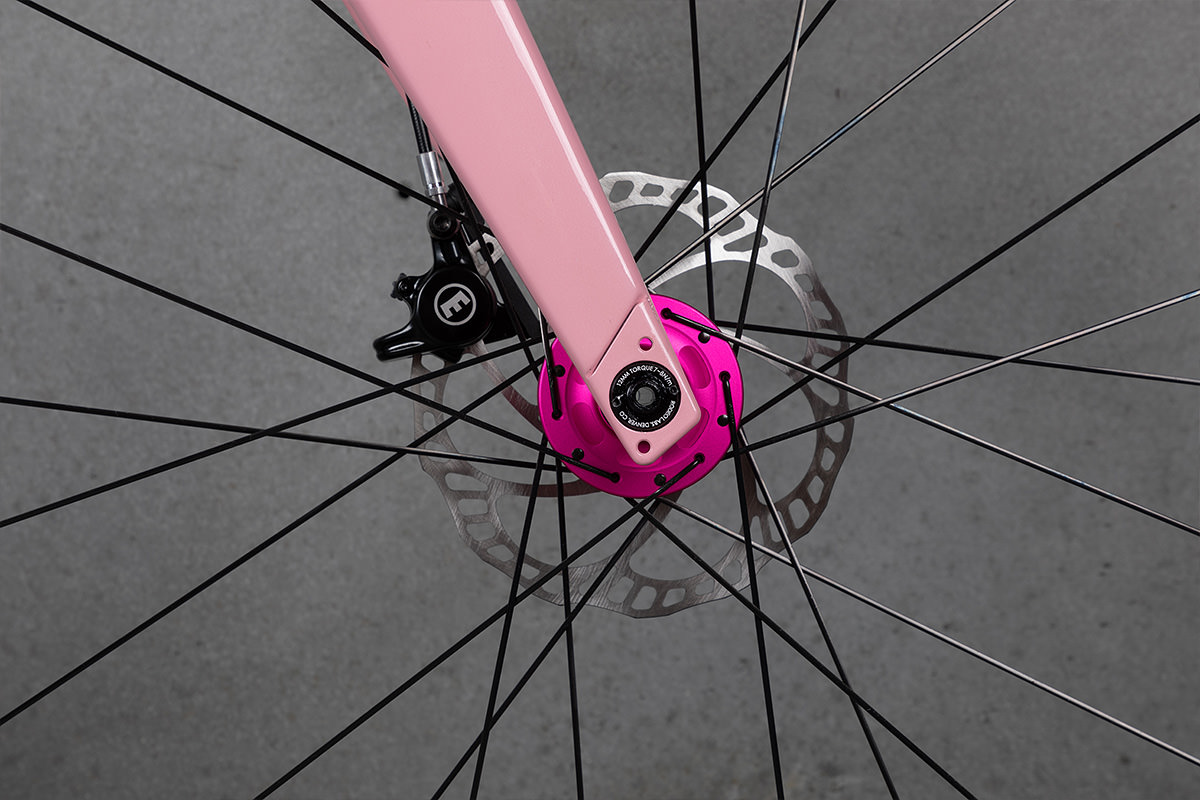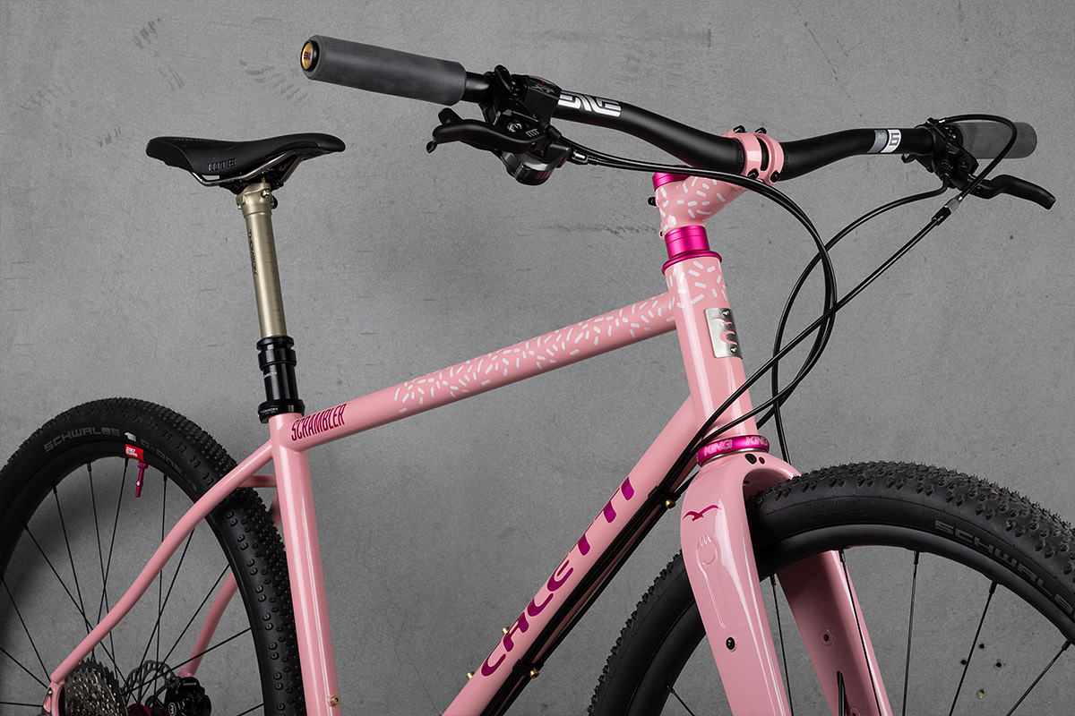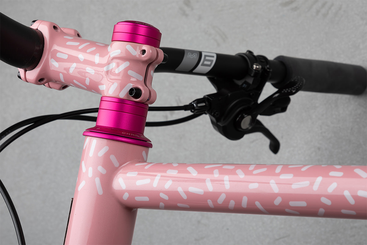 Covey opted for the Rodeo Labs Spork fork with bottle bosses on the legs for extra bottles — or a King Manything Cage. A full suite of hot pink anodized Chis King components is the icing on the, er… donut.