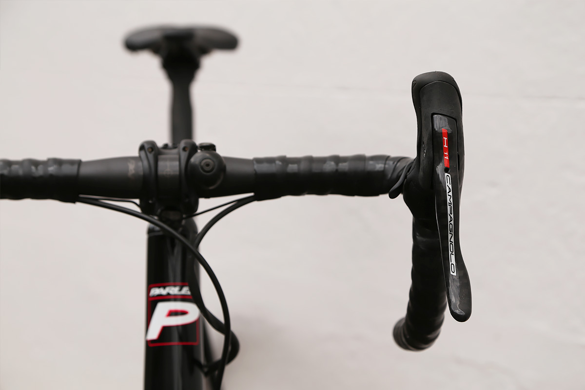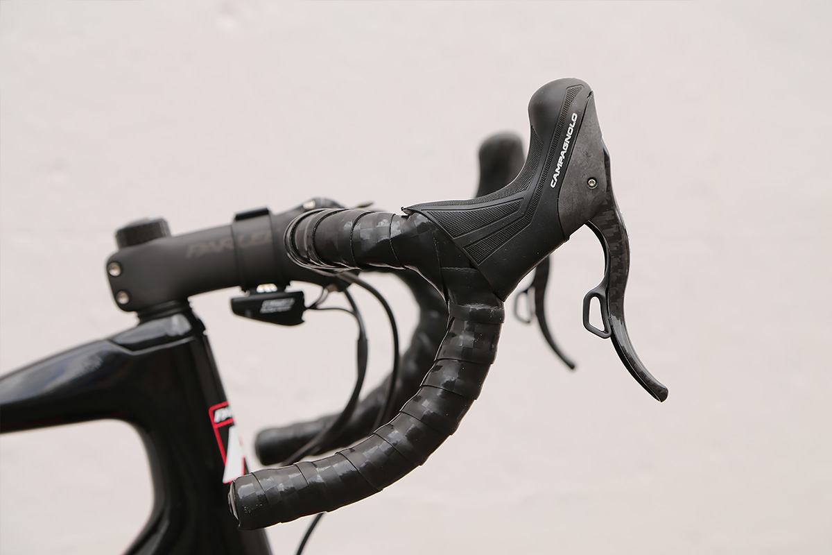 The calipers are finished in black to match the carbon on the rest of the groupset; and this also happens to help the white Campagnolo crest stand out nice and clearly.