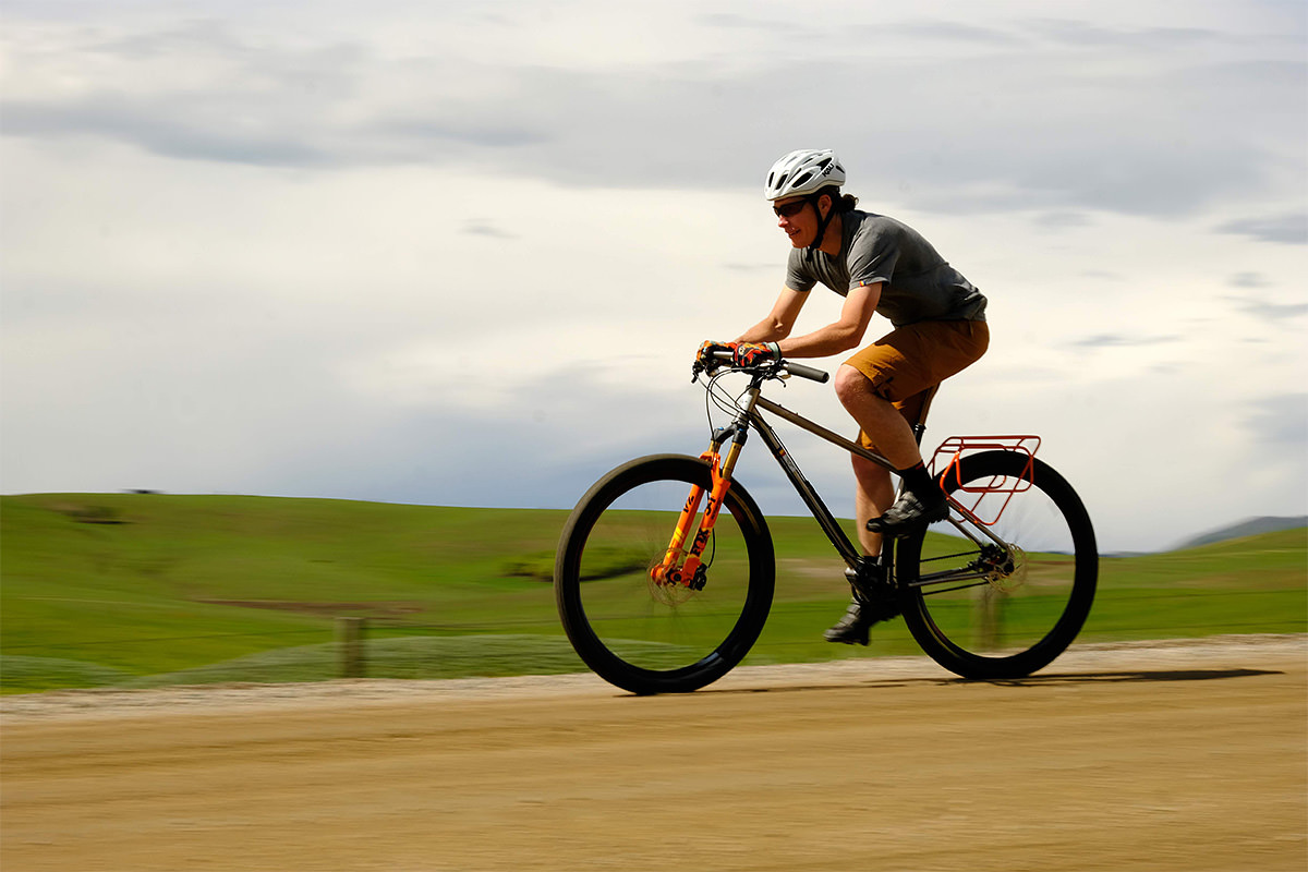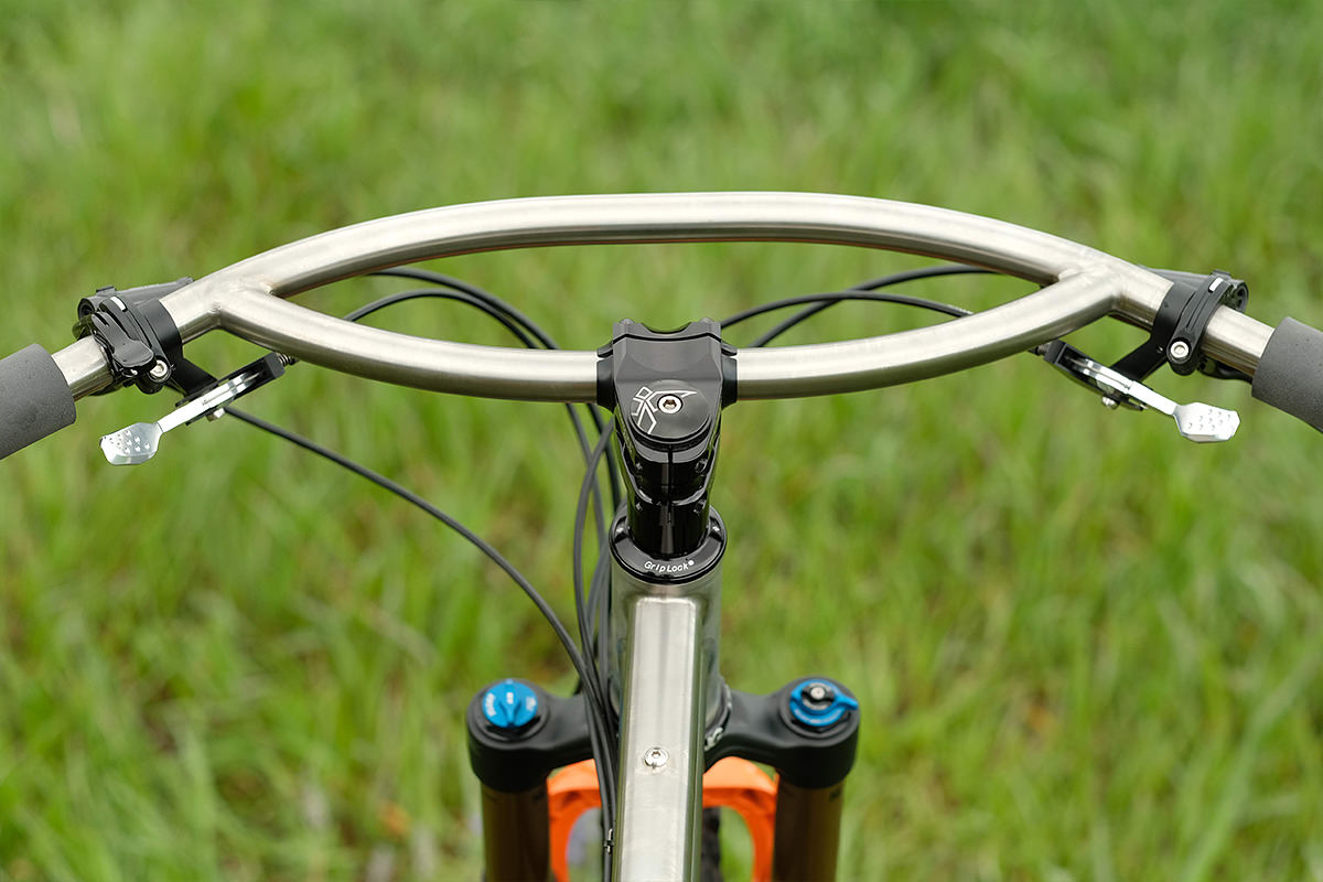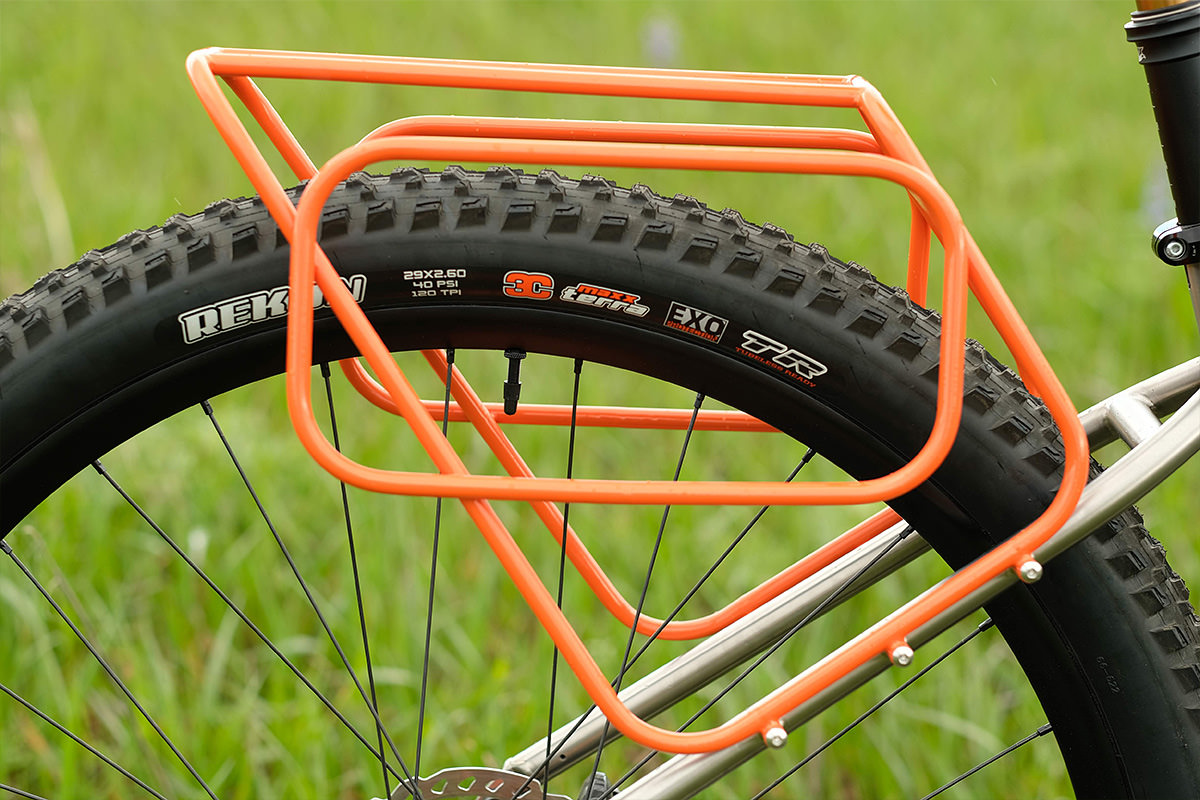 His Sojourner frame is designed to be a backroads/trail touring/bikepacking bike, but thanks to the modern geometry, it’s also a fun ride unloaded. Chad fabricated the titanium rack and handlebars as well.