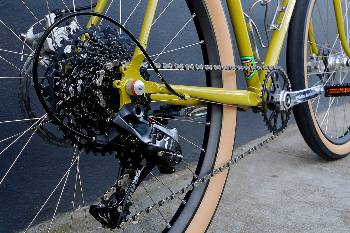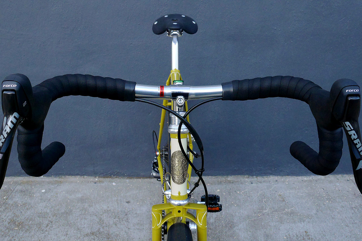 The drivetrain is made up of SRAM’s sturdy and reliable Force1 rear mech, their 10-42t XG-1195 cassette, and White Industries’ G30 gravel crankset. 36t-40t is the perfect gearing for the hills in and around San Francisco.