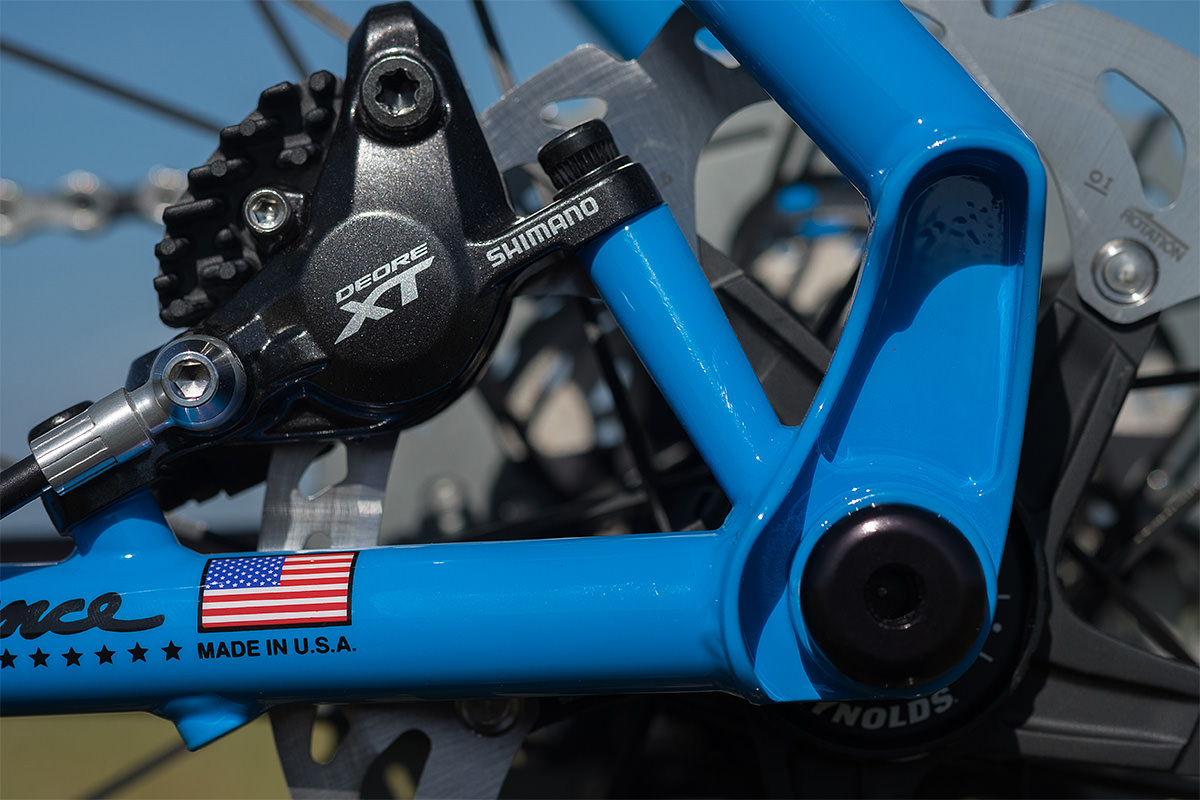The frames are designed and welded in the US from custom-drawn steel tubing, including stainless main frame tubes.