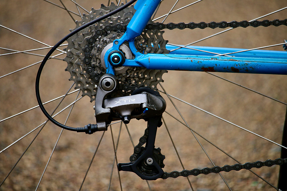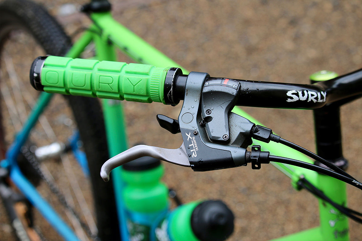 Nearly a full Shimano XTR M950 groupset was found, including cranks, rear mech, and brake levers, married to Avid’s classic Ultimate calipers. A Velo Orange rack was installed, and the Syncros post was replaced with a Thomson.