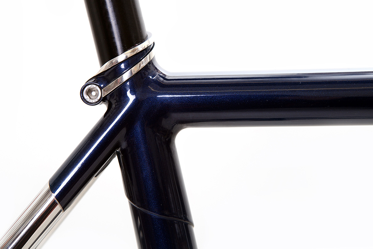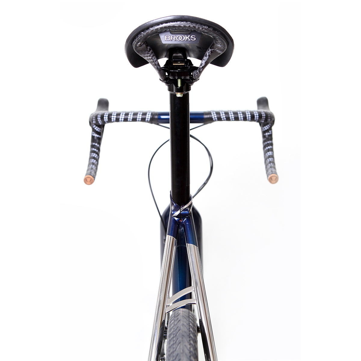 The frame is a union of British industry, crafted from Reynolds 953 stainless steel, Hope Tech hubs, Michaux Club handmade leather bar tape, Bentley Components bespoke art deco dropouts and Brooks‘ eagerly awaited C13 saddle.