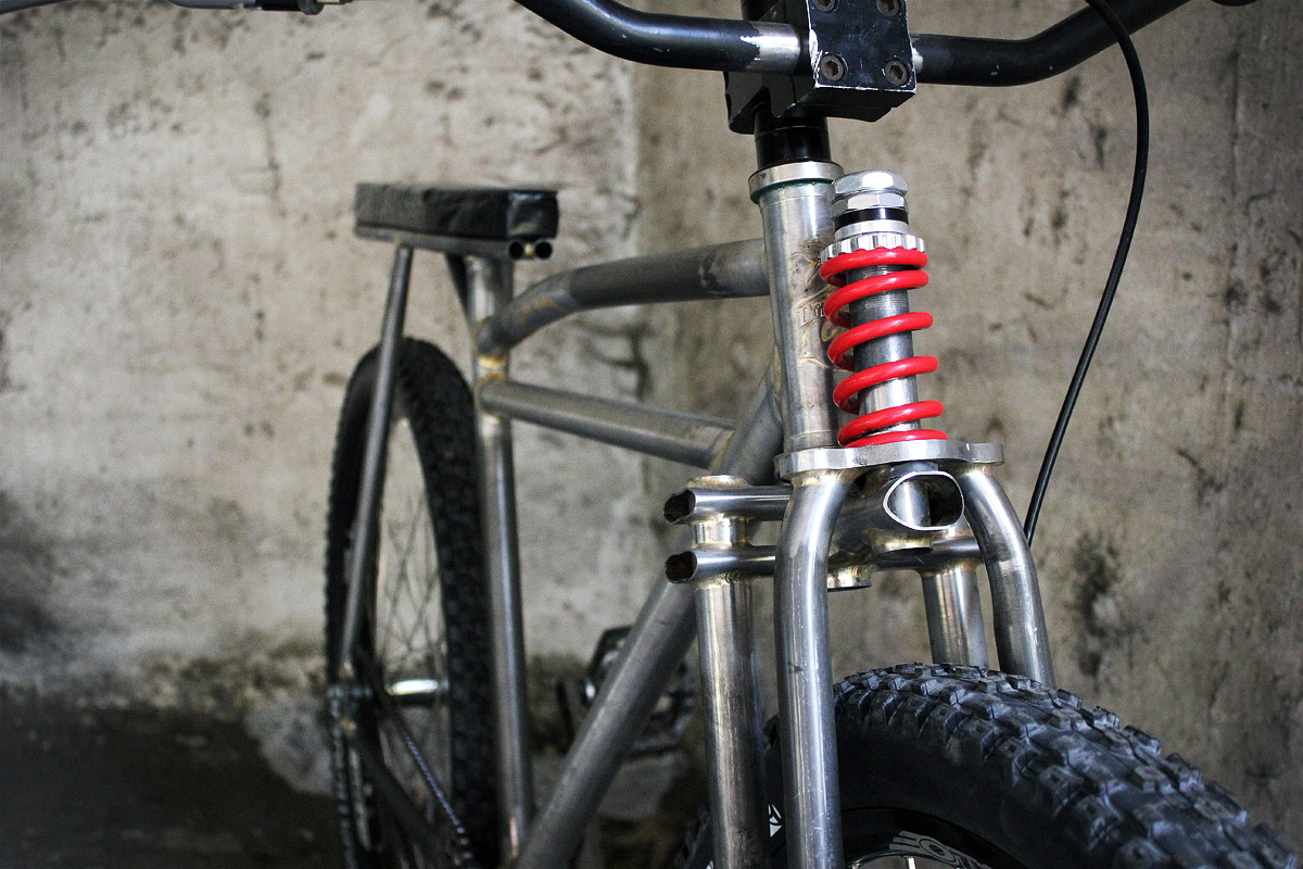 No, the shock was a cheap eBay buy, as all the shocks I had were too long. The shock in the picture is a 450lb and was all I could find in the last couple days of rushing around before the event. It’s actually far too hard and the fork will only really react to bigger hits. The only other spring I had was the spring out of my crown race reamer, which was a lot softer. For cruising around on it’s actually pretty good for a soft and springy ride! For racing on however it was too soft, just kept top and bottoming it out. It did prove that the fork actually worked great, with maybe 1.5-2″ of travel, with the soft spring it smoothed out roots and lumps really well. Until you use the front brake of course, then it just locks out!