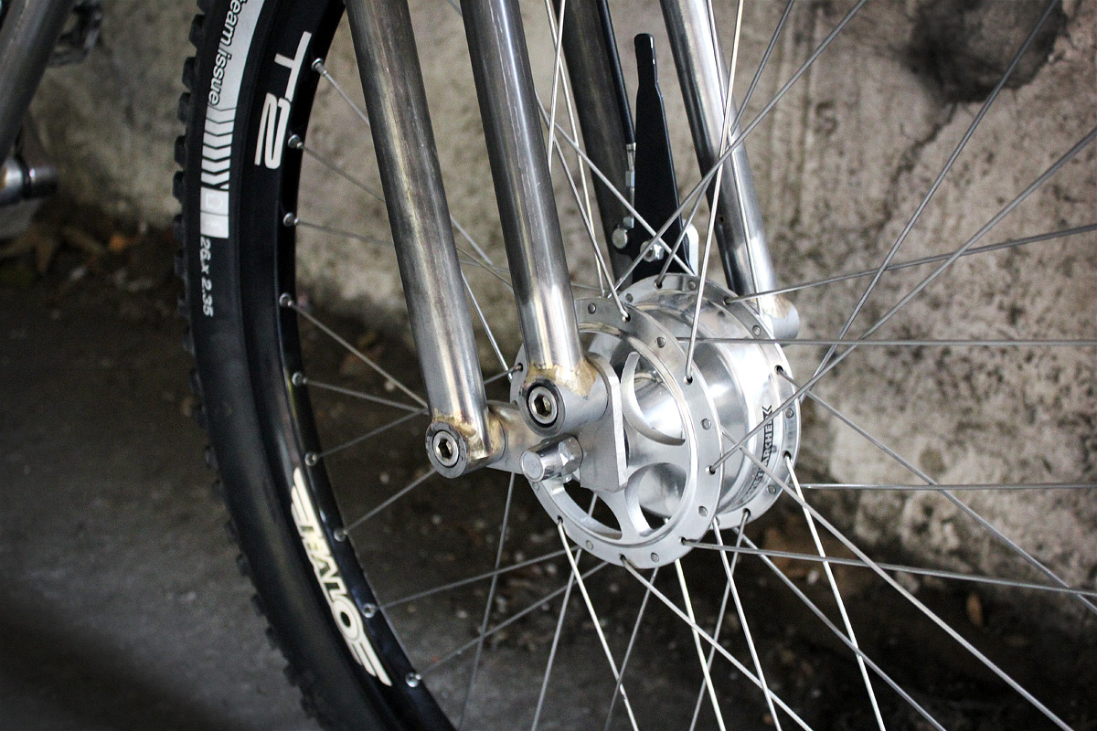 That’s not to say it’s clunky. Even with the short time he had, Tom engineered a leading link suspension fork and, from a perspective of geometry, cobbled together a bike that actually looks like it would ride very well. Tom is well versed in off-road riding, having raced back in the day, and won the first national downhill event he entered.