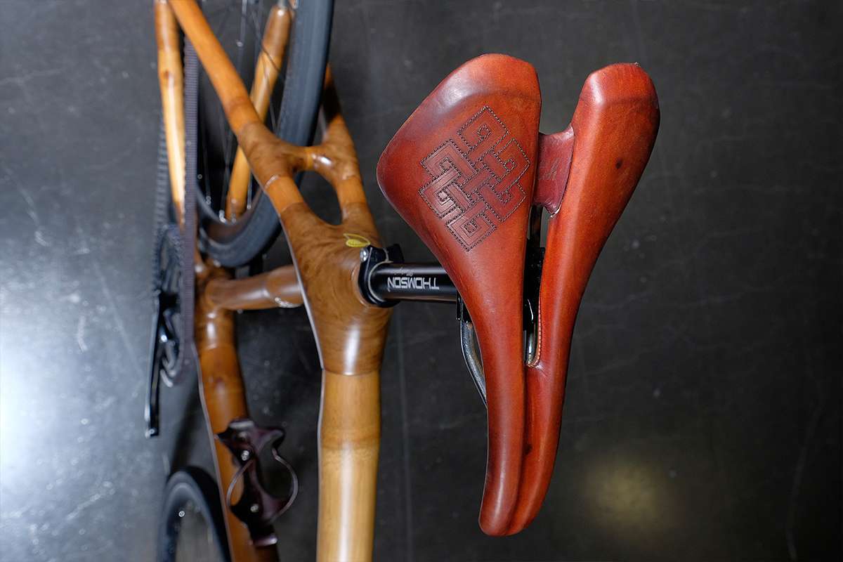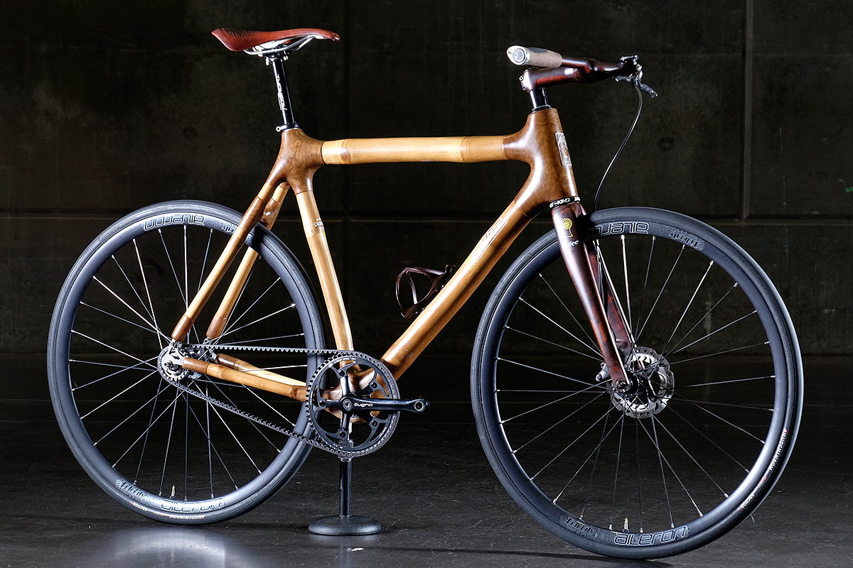 On this fixie, the warm tones are continued through to the leather saddle upholstered by Carson Leh. All of the bamboo frames made by Calfee are ready for a Rohloff or, like this one, a silent and clean Gates Carbon Drive, making for a very smooth ride.