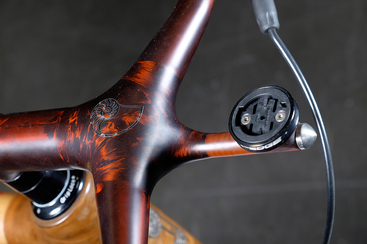 The one-piece custom stem and handlebar arrangement was painted with a deep red mahogany-like finish to match the forks, proudly set with the nautilus wheel logo of Calfee Design.