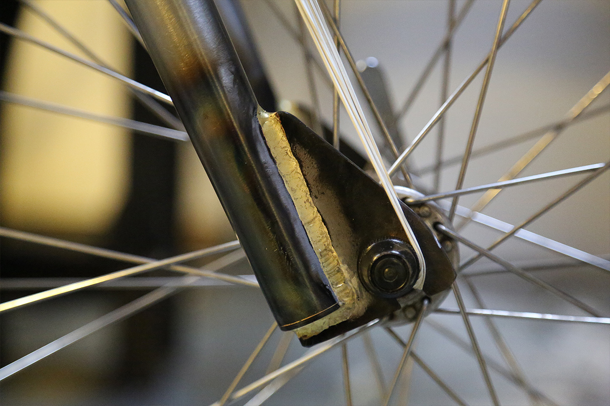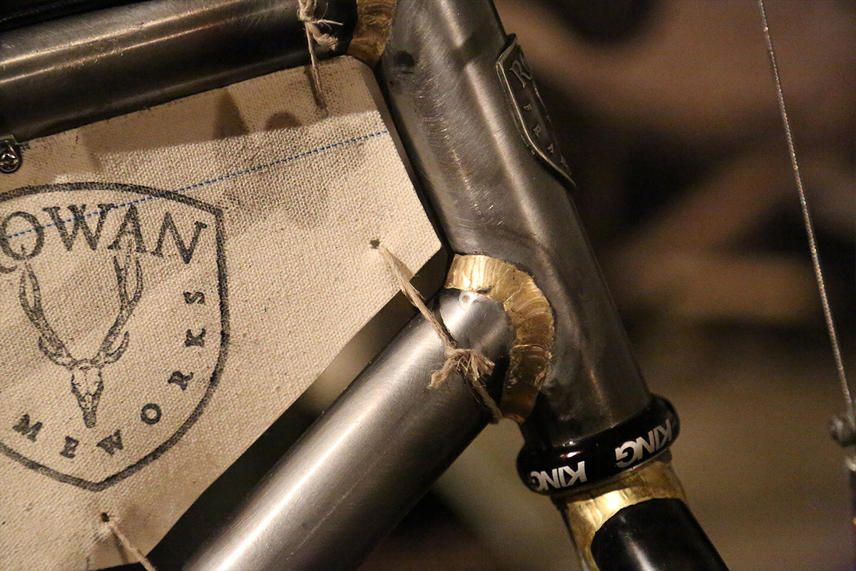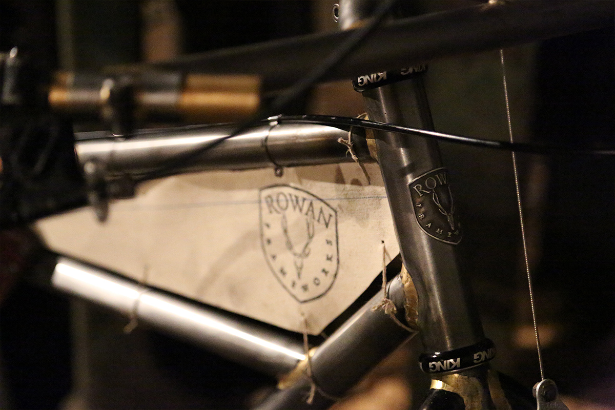 The dropouts were carved with an angle grinder. The Mafac brakes were sent with four right-hand springs, so tension was added to the left-hand arms with elastic bands. A ‘sail’ is tied to the frame with twine, and stamped with the Rowan Frameworks shield.