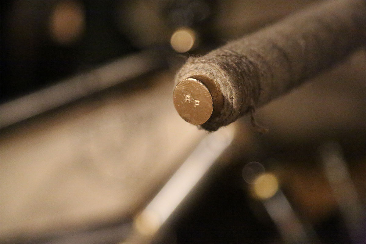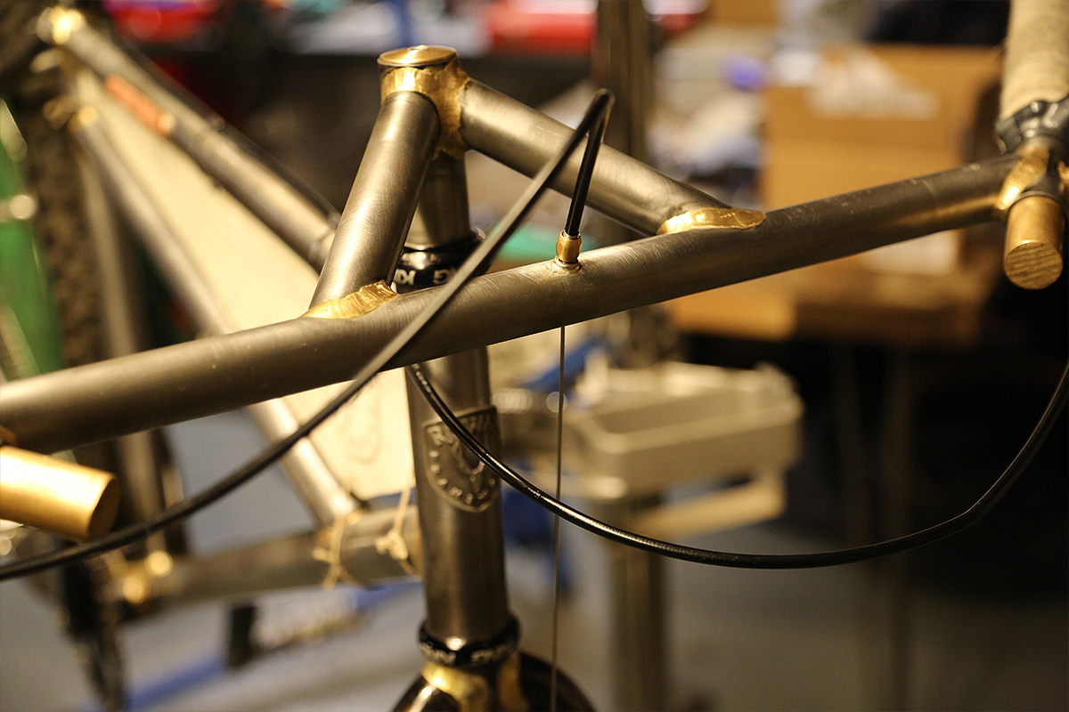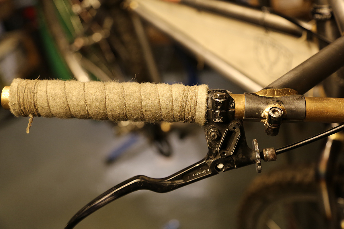 The handlebars were inspired by those made by New York’s Fast Boy Cycles’ Ezra Caldwell, using solid brass handles, which were then wrapped in felted Iberian wool, bound with twine and set with steam from the Academy’s espresso machine…