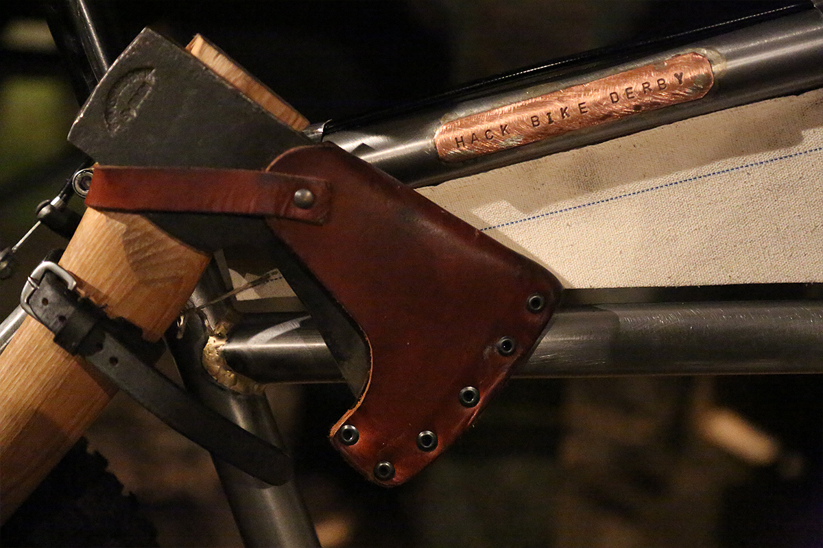 This weekend, some of the UK’s newest and quirkiest custom bikes will participate in a top secret weekend event in Somerset. It’s called the Hack Bike Derby, and this axe-wielding klunker is Tim Rowan’s entry: The Woodsman.