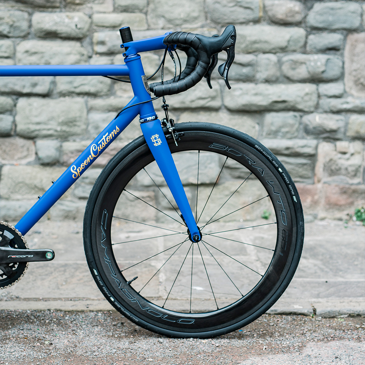 The bike is a custom-tuned version of the Izoard RR, built with Columbus Spirit tubing, expertly TIG-welded by hand in Northern Italy by Spoon Custom’s fabricators. It is finished with Deda’s Super Zero kit, painted to match the mesmerizing frame.