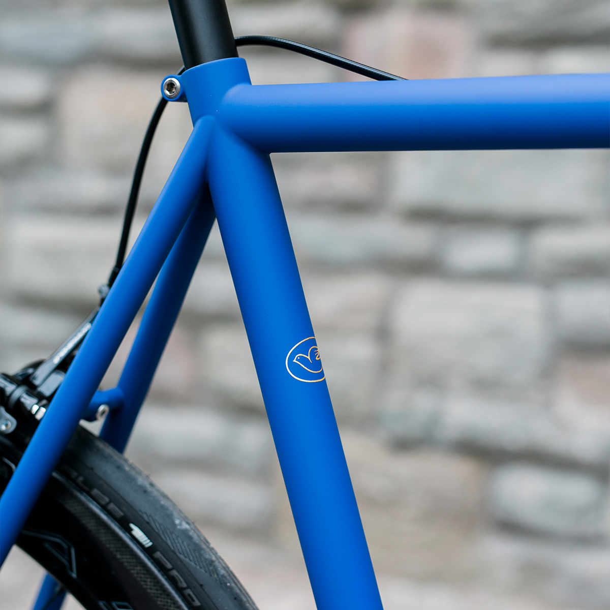 Another hallmark of Yves Klein’s work was the use of gold leaf. Spoon Customs regular paint-slinger, Sam Weeks, is somewhat of an expert in laying 24k gold leaf, evidenced by the down tube and fork branding, as well as the Columbus dove on the seat tube.