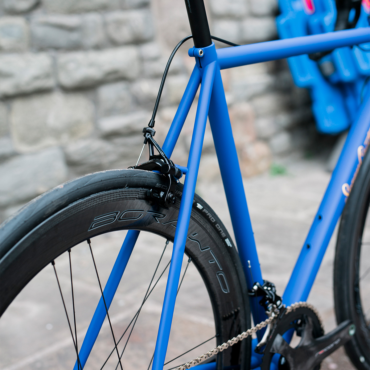 The rest of the ensemble consists of Campagnolo’s new Record 12 groupset and their new 60mm WTO Bora wheelset. Brooks’ All-Weather C13 carved Cambium and their Rubber Bar Tape complete a very continental bicycle.