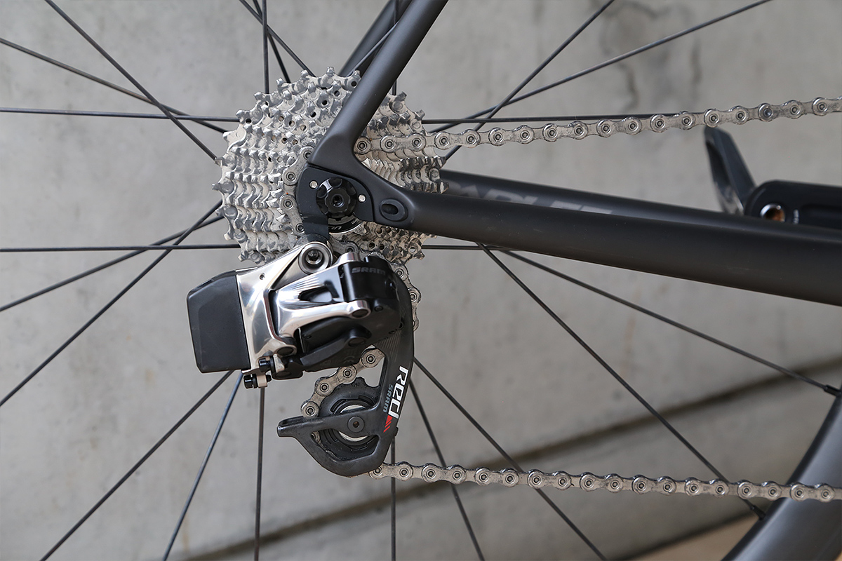 The rear mech isn’t significantly bigger than a Shimano Di2 unit either – although the eTap mech is quite distinguishable given how far it hangs behind the mounting position compared to other derailleurs due to the battery being attached to the back of it.