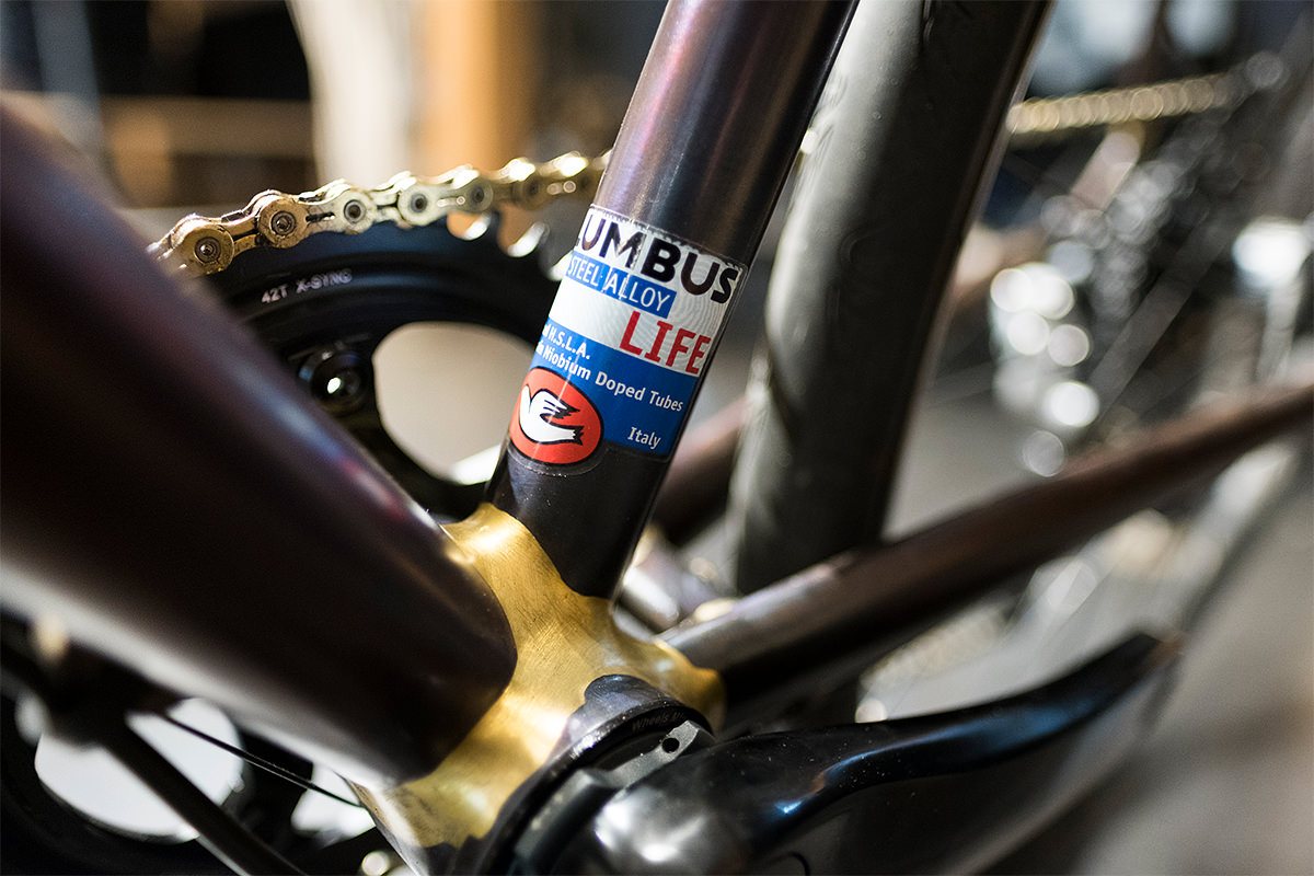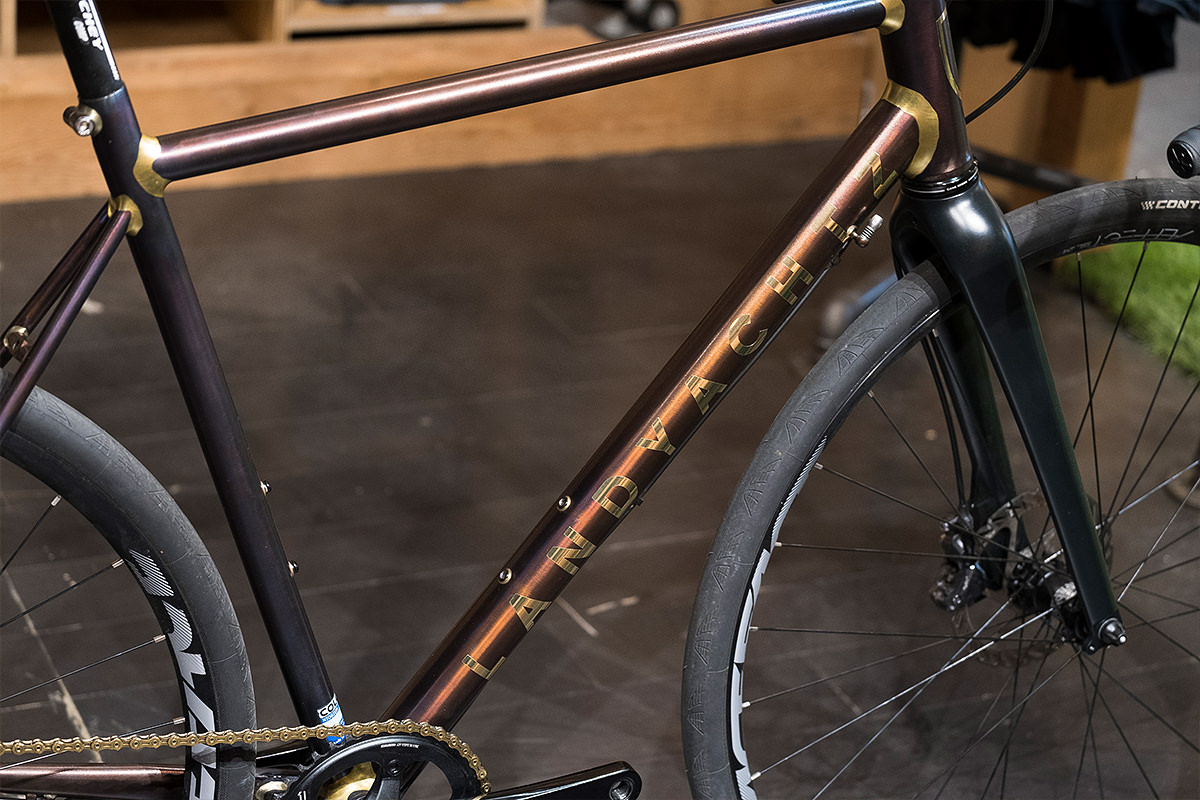 For this frame Landyachtz chose a fillet brazed Columbus HSS downtube to get that stiff feeling and paired it with a mix of Life and Zona tubing. His frame was then finished with parts from Paragon Machine Works, including a PF30 BB which increased stiffness.