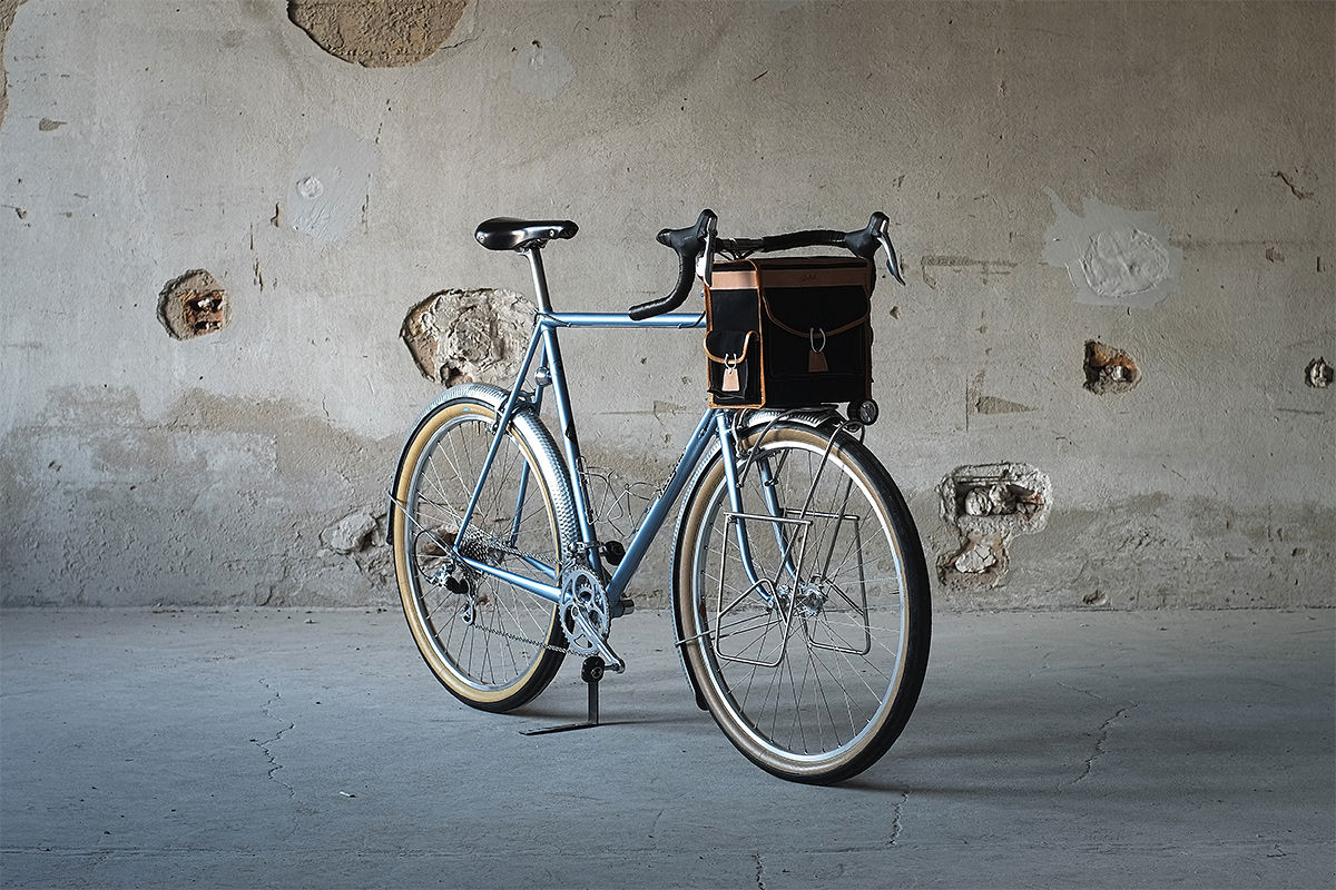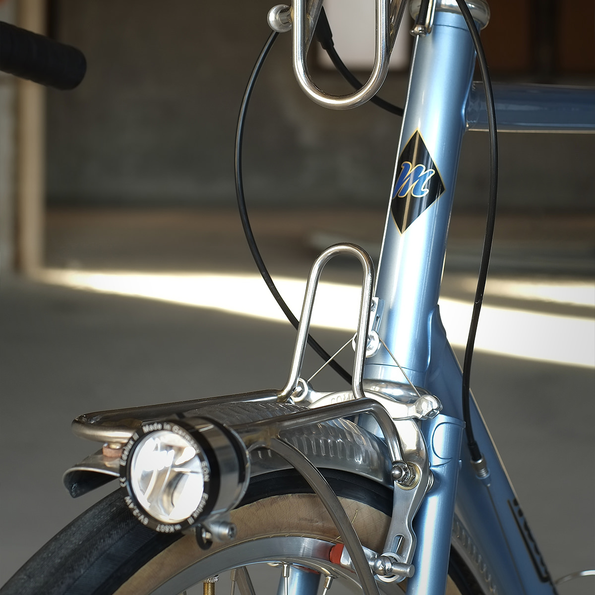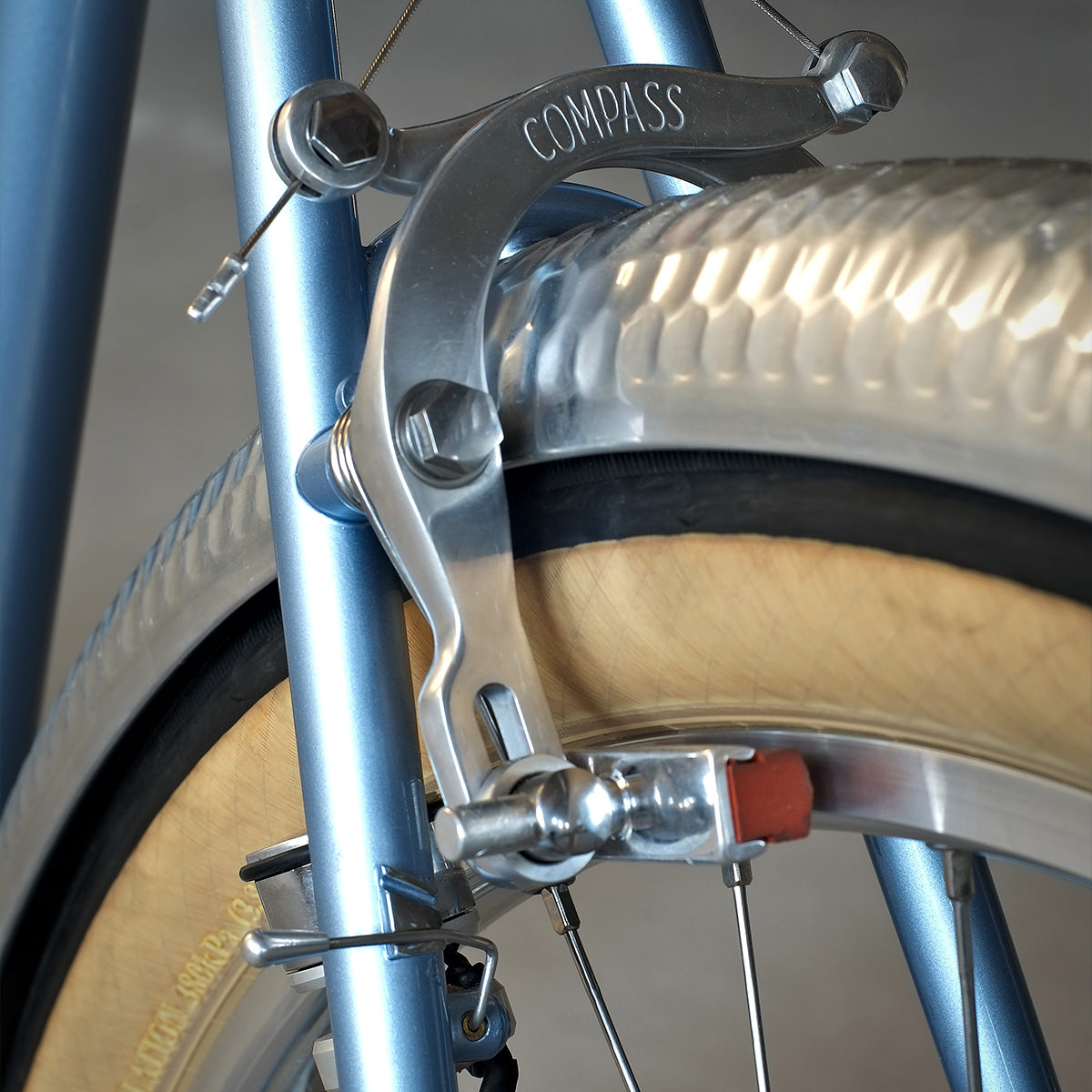 As mentioned, Torsten is a fan of the Bicycle Quarterly aesthetic, so requested a traditional randonneur with accompanying accouterments such as hammered fenders, René Herse cranks, Compass brakes, a custom set of racks, and a Velogical rim dynamo.