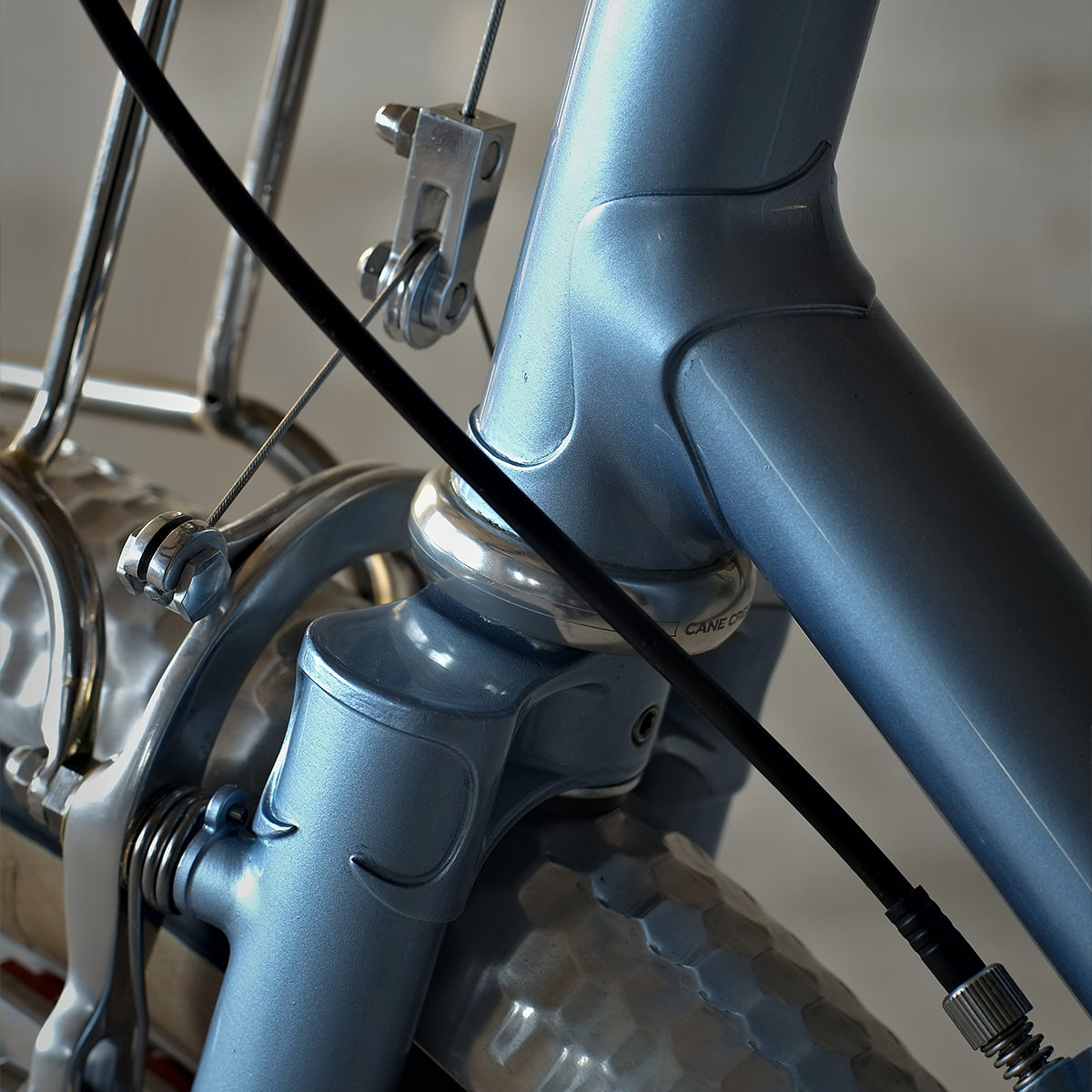 The frame is constructed from lugged and ovalized Reynolds 631 and 853 top and down tubes and a shimless 27.2 seatpost, a horizontal top tube, and a fastback seat cluster. The MX head tube lug had to be modified: it’s basically a double bi-laminate construction.
