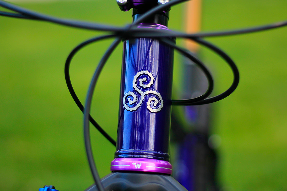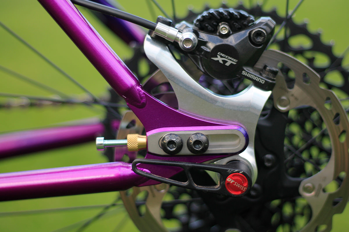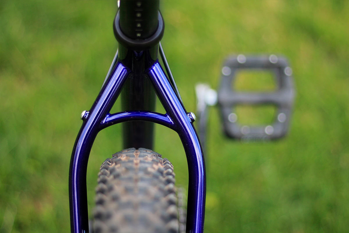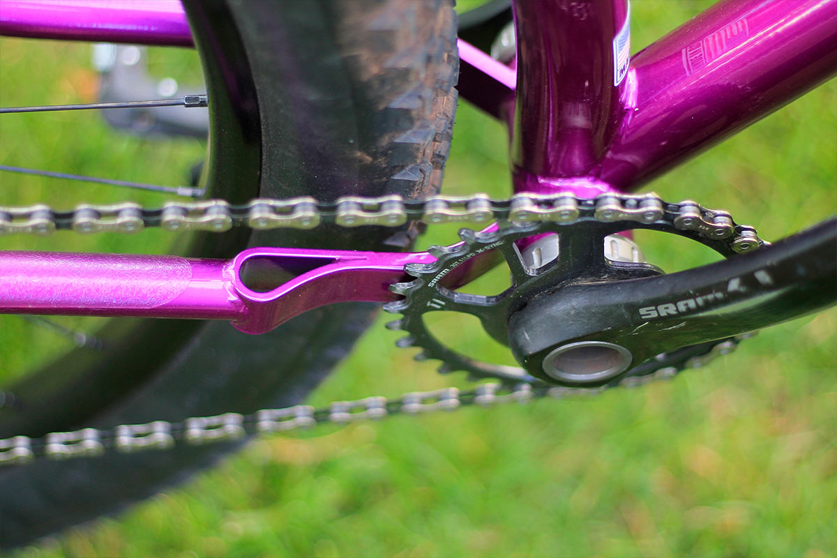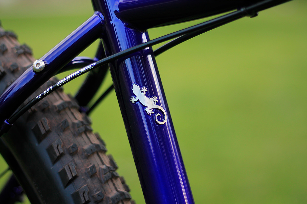 The proprietary chainstay yoke is a surprisingly simple and pleasing solution to the design conundrum of balancing short chainstays with big wheels. A detail that will keep Eric company on the trail is Gus the Gecko, silver brazed onto the seat tube.