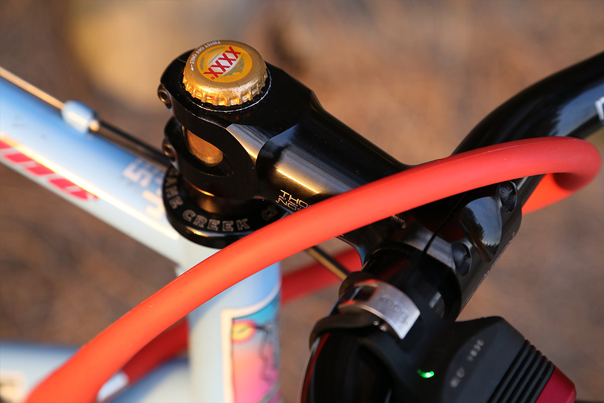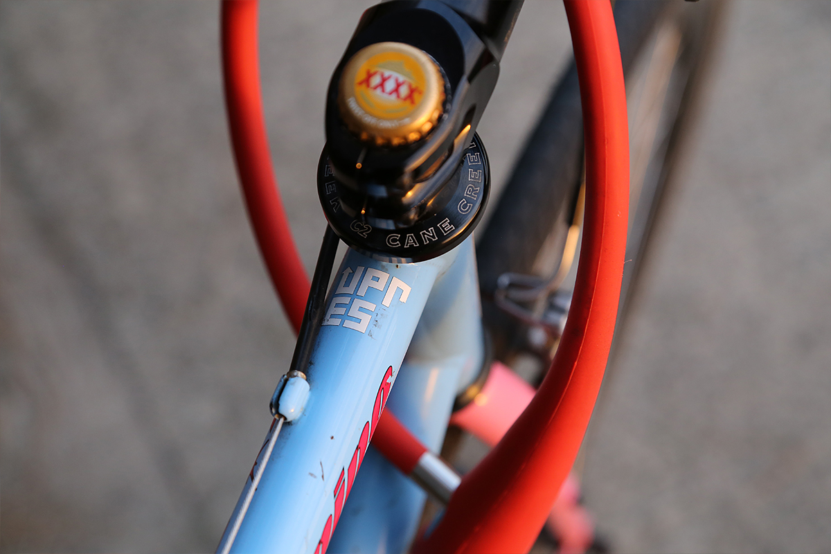 Having said that, the Cane Creek C2 headset is the original and is still as smooth as the day it was installed. The forks aren’t original. The stock forks were destroyed in a crash while tagging a car by its wheel arch, so Tarn at Primate Frames made me a new pair.