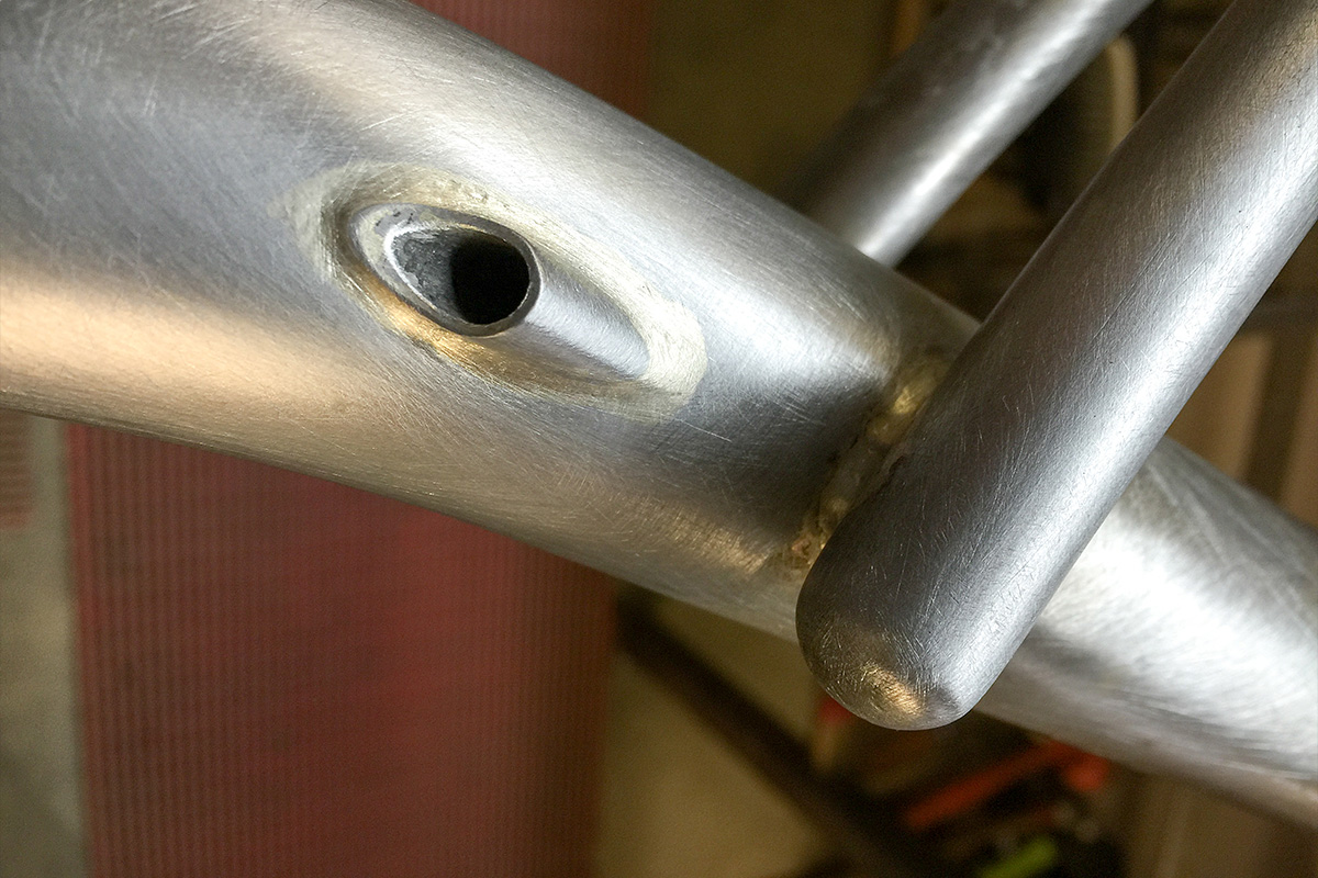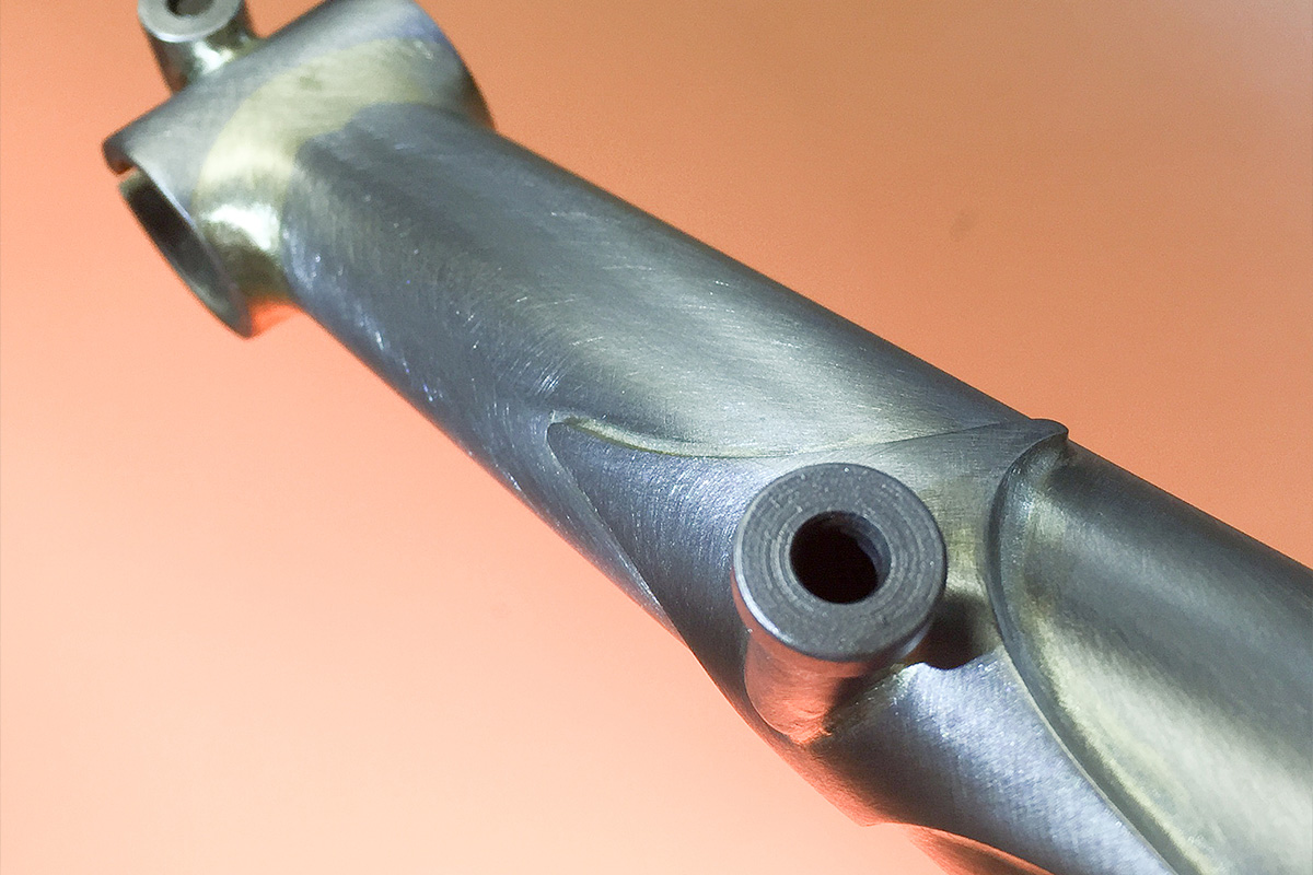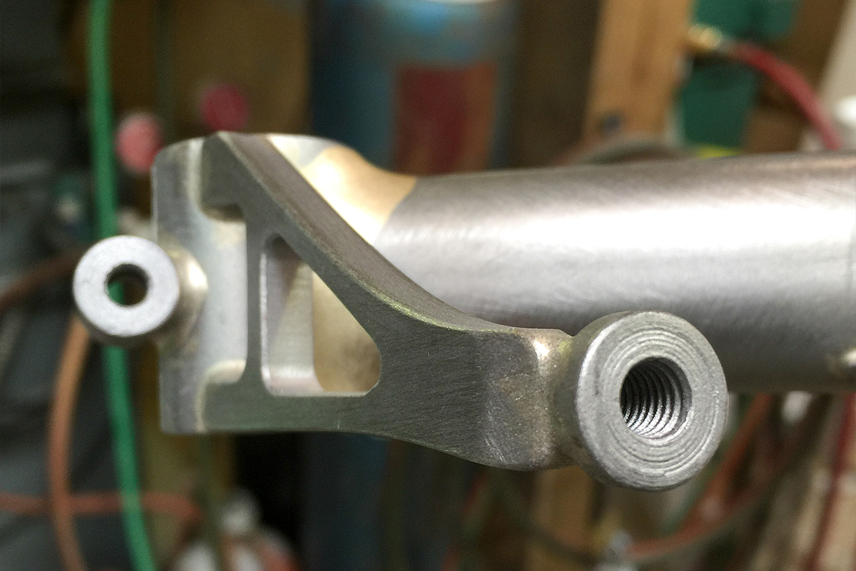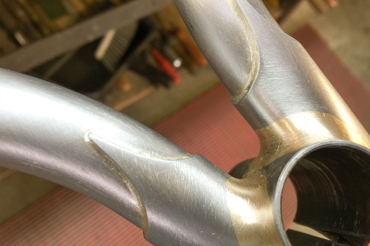 Continuing on from yesterday’s steps, it’s over to Paul: Curved tubes are nickel-silvered into the structure, and everything is sanded smooth. This is the back of the left fork blade. The top post mount for the front brake is complete.
