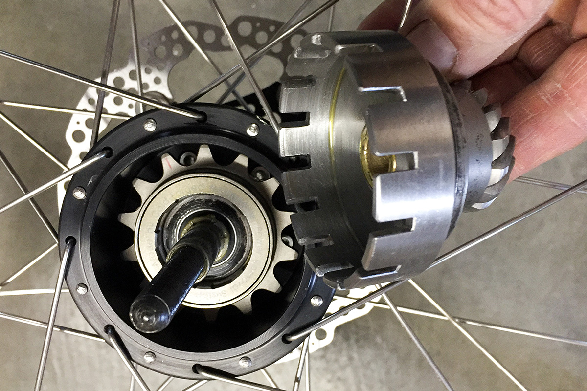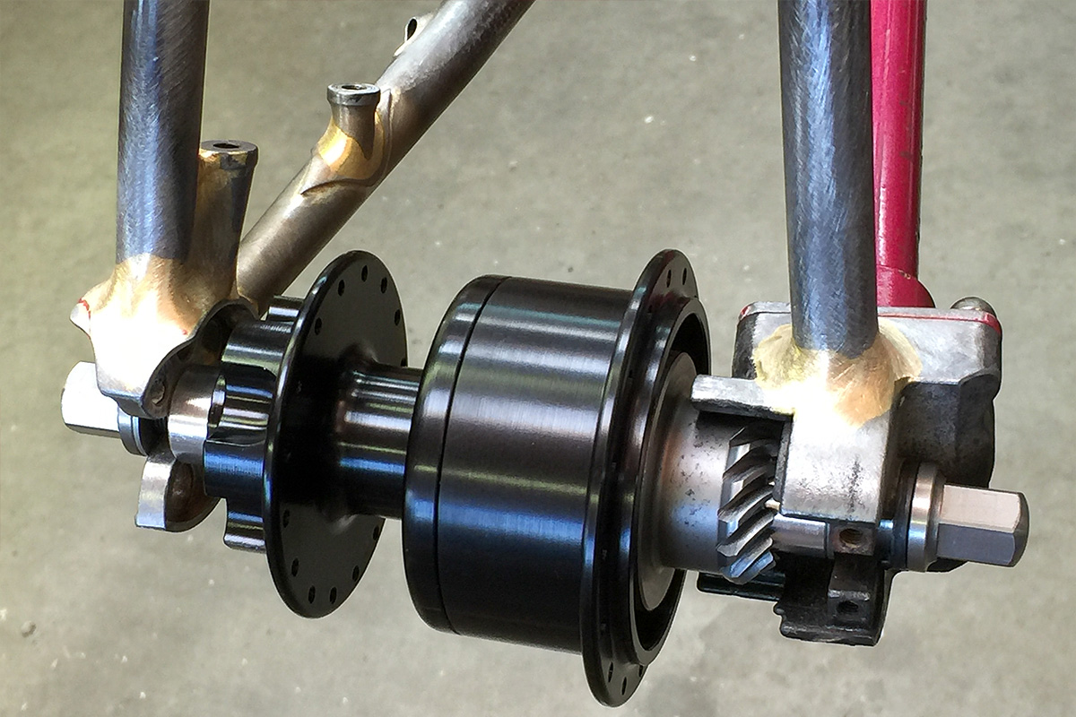 The stock bike came with a 5 speed Sachs rear hub. I couldn’t get it to shift, it was ugly, and it didn’t have a disc rotor mount. The only thing I saved was the helical gear that meshed with the shaft drive.