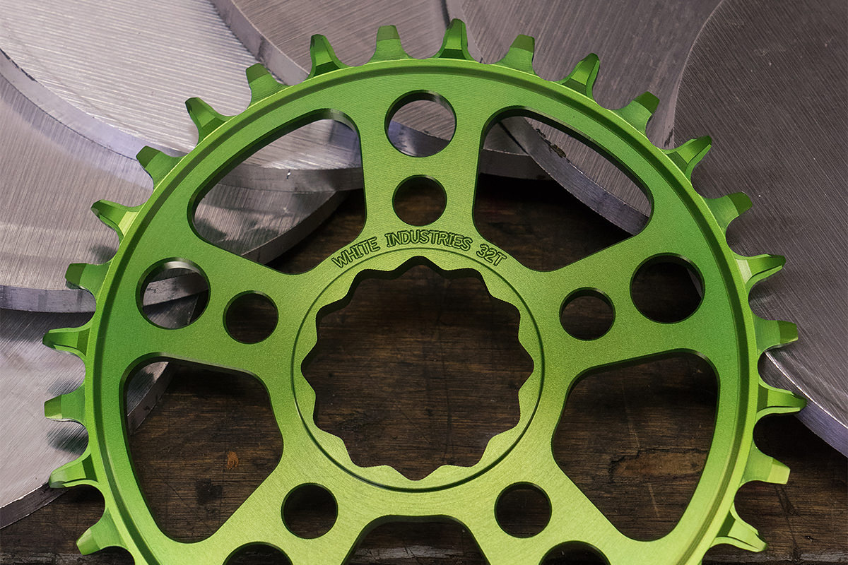 Petaluma’s White Industries jumped in with their legendary cranks, chainrings, bottom bracket, freewheel and their new headset. Velocity rims weren’t far behind with a pair of their bombproof, US-made Dually rims. All of the ingredients were taken to the anodisers to be hit with a beautiful, sparkling, Pale Ale Green.