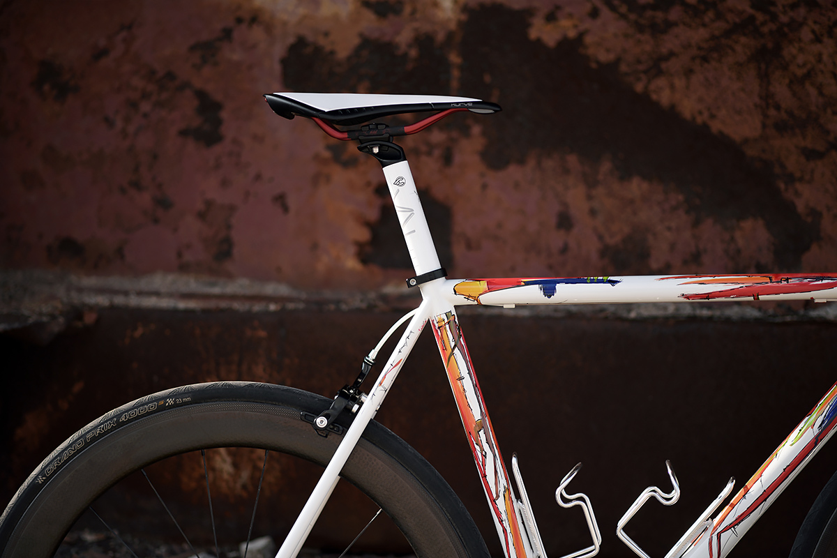 Mike Fiechtner is the custodian of this fine example of Dario’s work, a stablemate of the Festka Asphalt built up by Hong Kong’s Life Cycle bike boutique, that we featured a while ago. One of Mike’s favorite artists is Jean-Michel Basquiat, who Dario claims as an influence upon his own art.