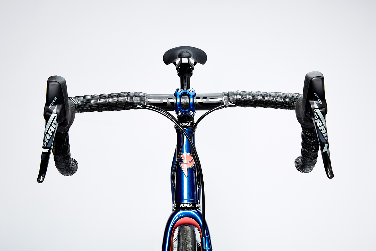 The axle-to-crown of the ENVE gravel road fork is great, as it allows for a good-lengthed head tube when using a lowish BB and fatter tyres. Using a slightly sloping top tube allows for balanced comfort from more exposed seat post compliance and allows sufficient space for a frame bag.