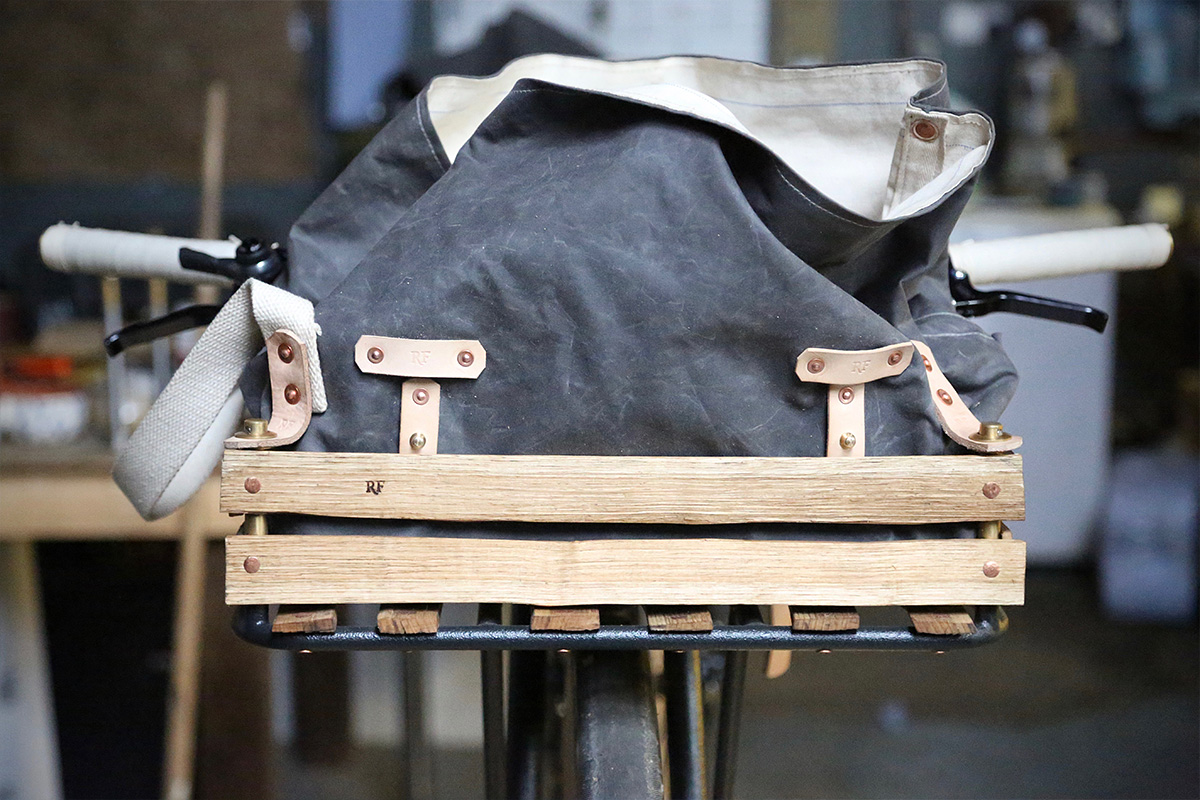 It has the best parts we can imagine, with no compromise. A solid, fast and light frame built from Reynolds 853 DZB steel, segmented forks that fit the custom rack, all covered in two textures of this amazing ultra tough paint that we’re very excited to be using — it’s super durable all over, and ultra durable in the places that take the most shit. We’re so proud of the sweet, sweet chestnut crate on little brass posts, with a clever little attachment for the waxed canvas bag that fits inside.