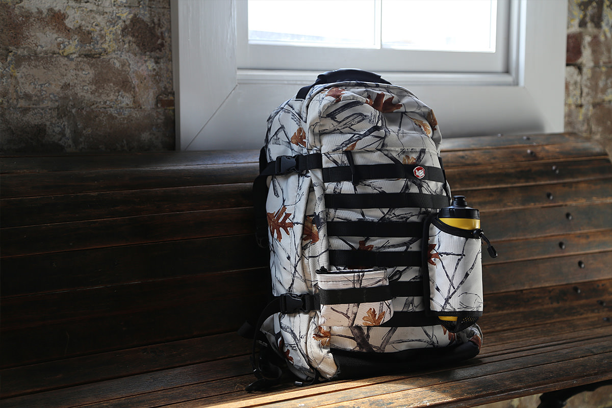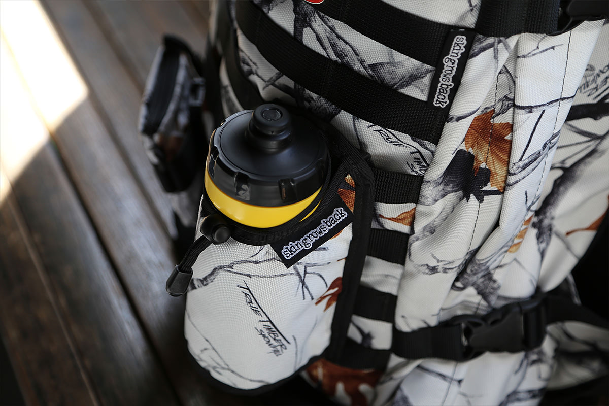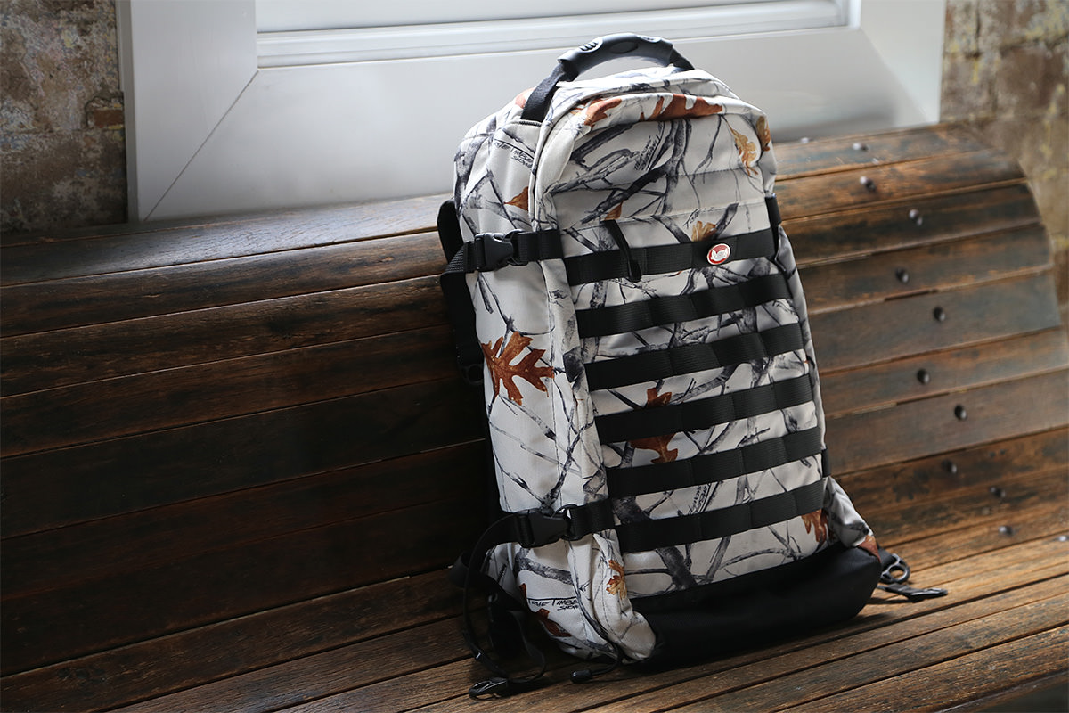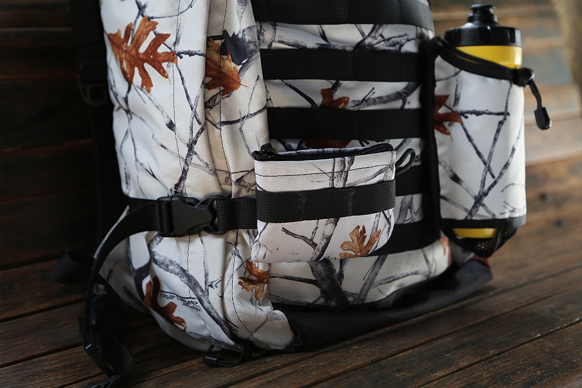 The outer shell is a tough nylon: an incredible range of True Timber camouflage prints (like the featured Snowfall) in 900D Nylon, or 1000D in the ‘plain’ colors — and black. The exterior features six MOLLE strips to which can be attached a multitude of smaller accessory pouches. My Kryptonite Mini D-Lock is usually threaded through them.