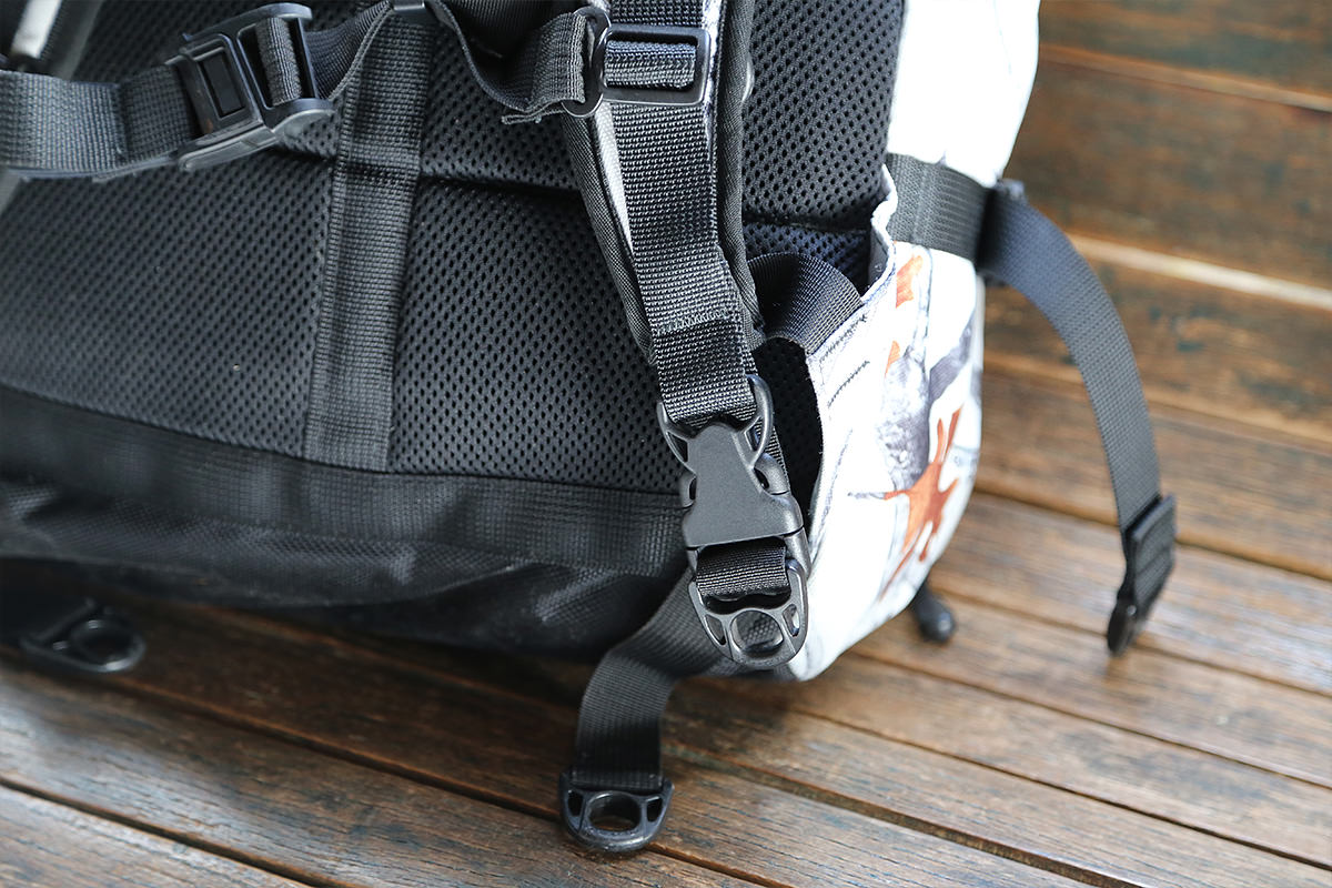 The wide EVA foam straps offer a high amount of stress distribution and are adjustable, as is the sternum strap. The magnetic slide is completely secure and has never come undone. Four compression straps keeps the load tight and doubles as attachment points for the skingrowsback Helmet Scoop.