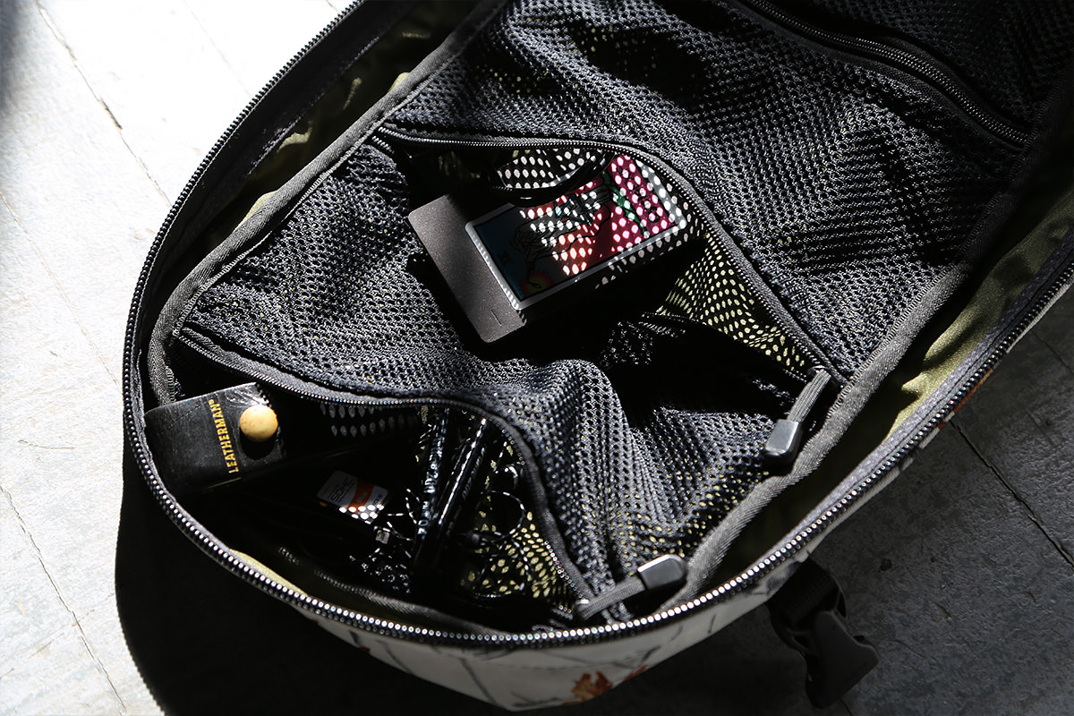 The PAK30 opens completely via a Number 10 YKK zip to reveal a cavernous 30 litre compartment. There’s a mesh sleeve that fits a 17″ laptop and an external hard drive or two. On the inside of the front flap are three more zippered mesh pockets. I keep my Leatherman and pens in one and my power cords in the bottom pocket when travelling.