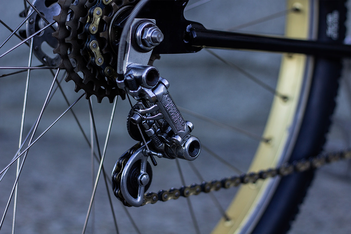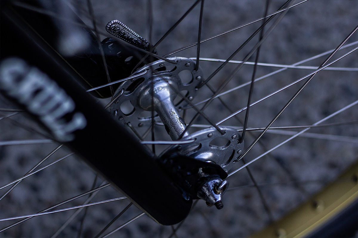 True to the style, Tim built up his 2nd Generation Skull Skates cruiser frame with a mix of vintage Campagnolo and BMX parts, including a Campy Record front hub, an old Jacky Hayes racing rear hub, a Record rear mech, Gran Sport cranks, Araya 7x rims, GT DX pedals, MAFAC brakes, Renthal motocross bars, and an ancient Ideale saddle.