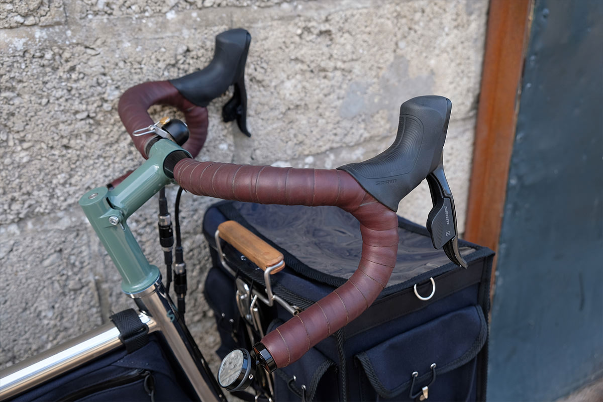 Darron worked with Gav at August Bicycles who built the forks, designed the chainring spider, and that amazing stem with a seamless, integrated top cap. Gilles Berthoud provided the custom luggage, including the tool roll under the saddle.