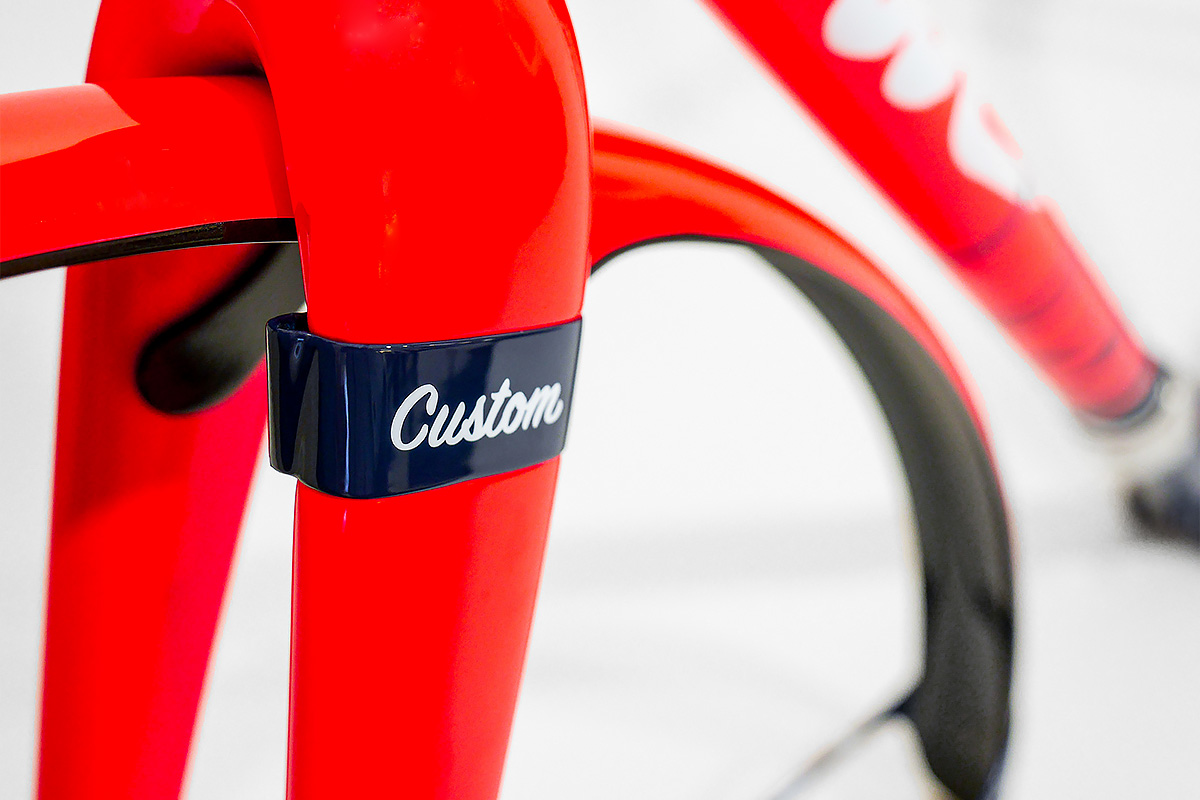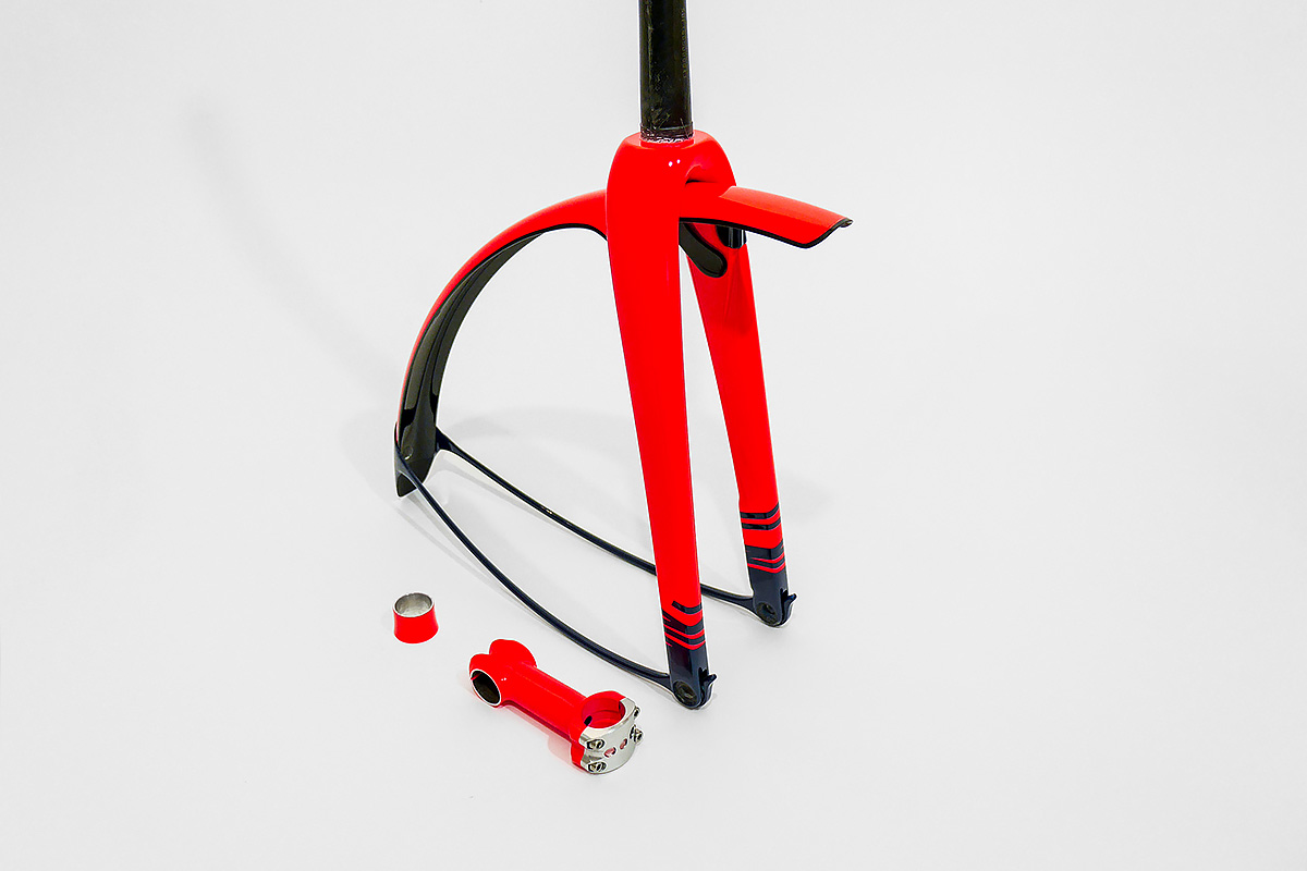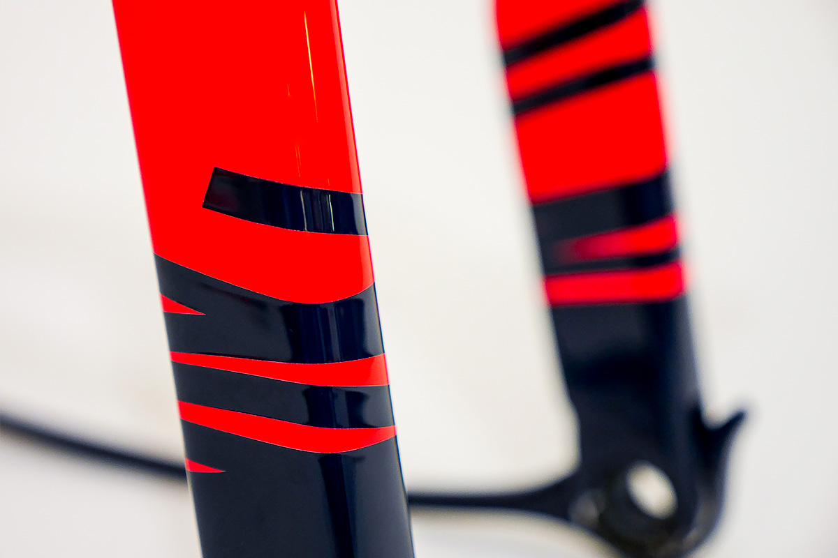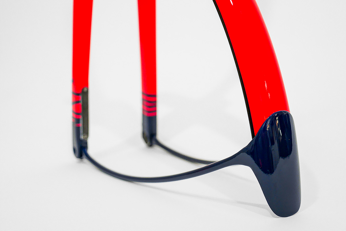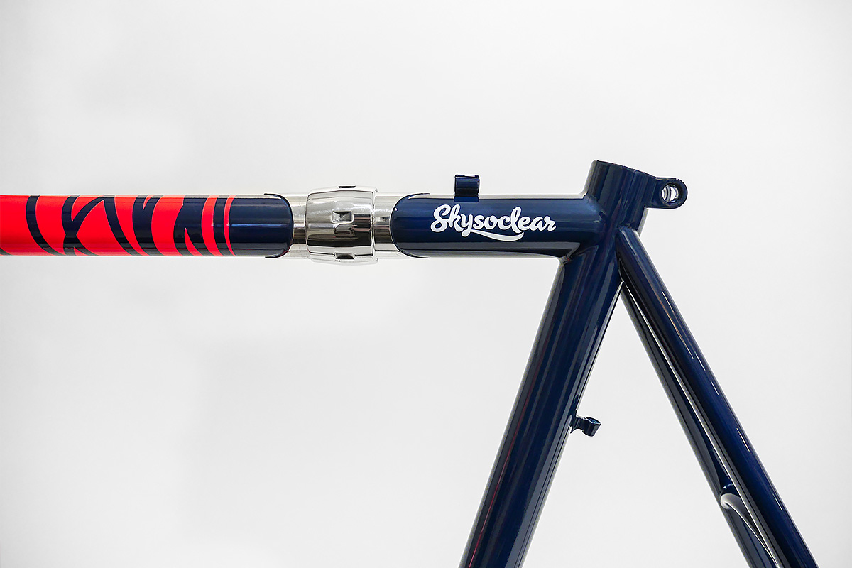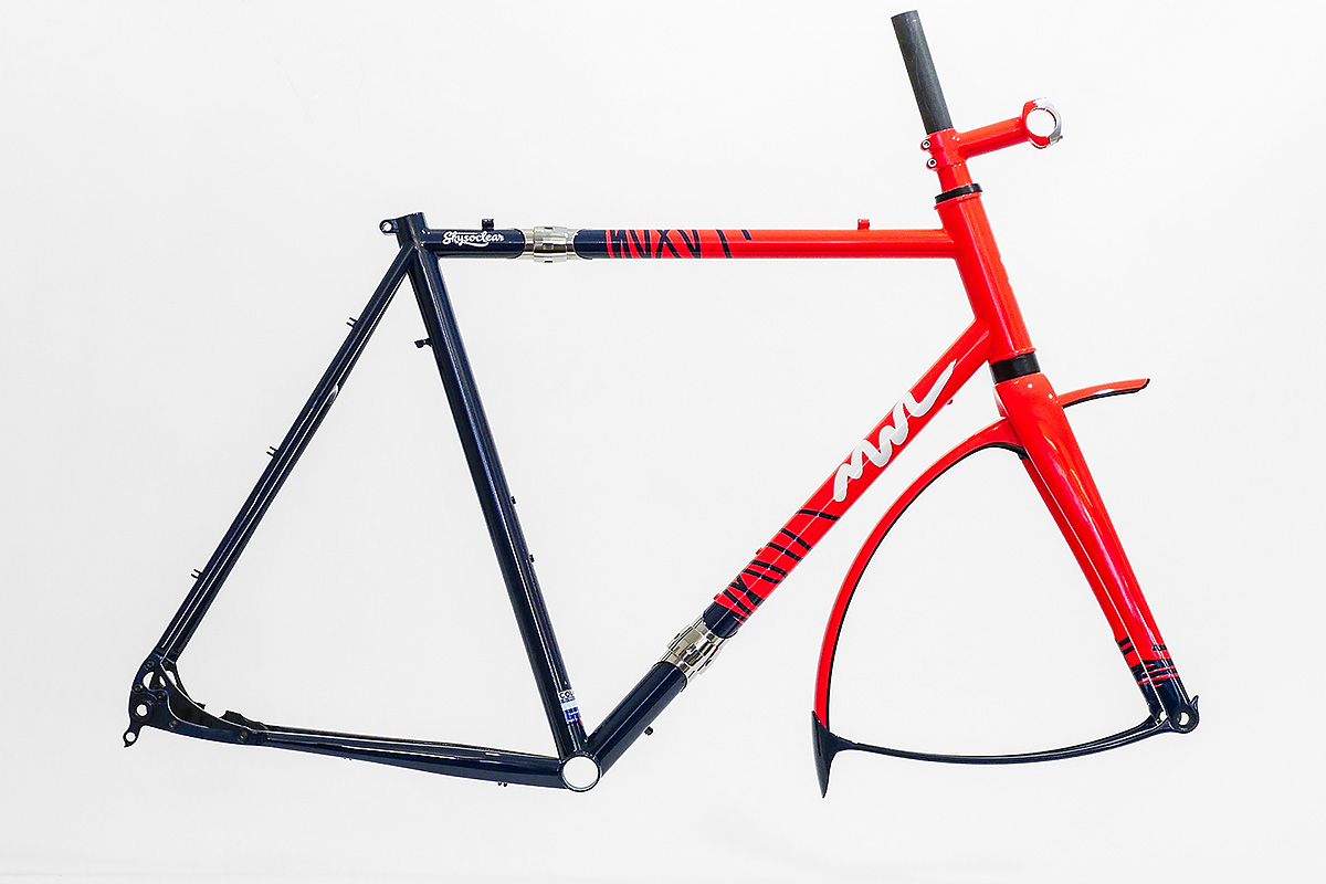 The natural break in the frame created by the couplers was the starting point for the paint. To emphasize the fact that the frame separates in two, the deep blue shade of the rear unravels wildly into the violent orange of the front.