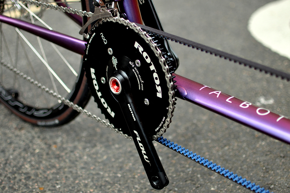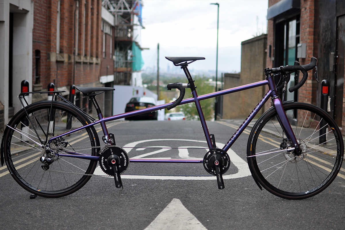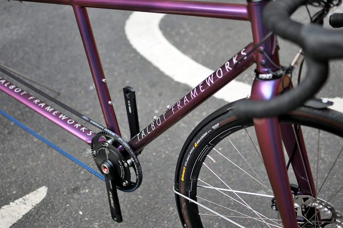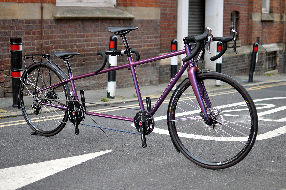 Matthew used a tandem-specific jig for the job to fillet braze the main frame, but he still had to build a lot of custom tooling for specific tasks. Even the drivetrain is out-of-the-ordinary, a combination of Di2, Gates Carbon belt and custom Rotor chainring spiders.