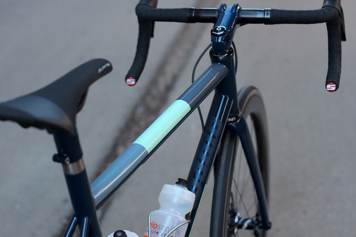 The RT-1D is a titanium frame whose rear brake cable is routed through the downtube. It sports a 44mm head tube, here housing an ENVE 12mm thru-axle road disc fork. The frame is wearing Mosaic’s new customizable color scheme, applied by Spectrum.