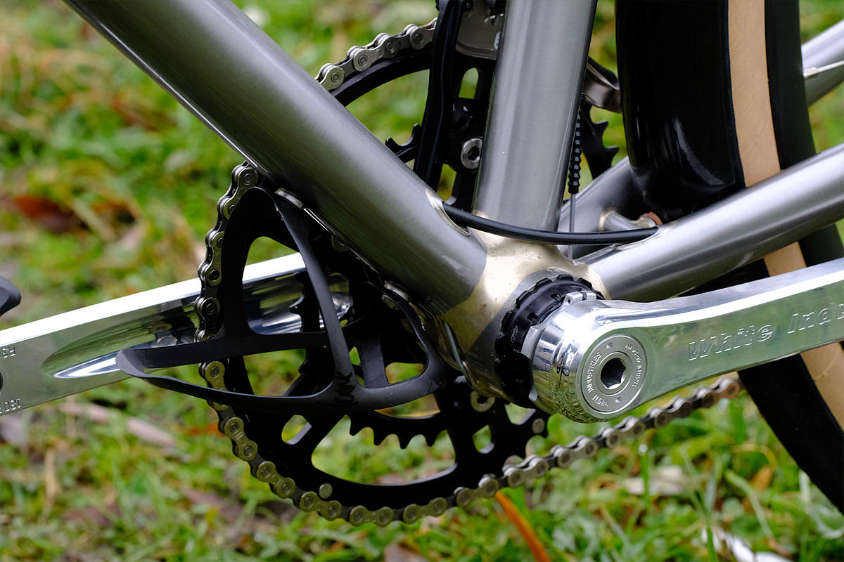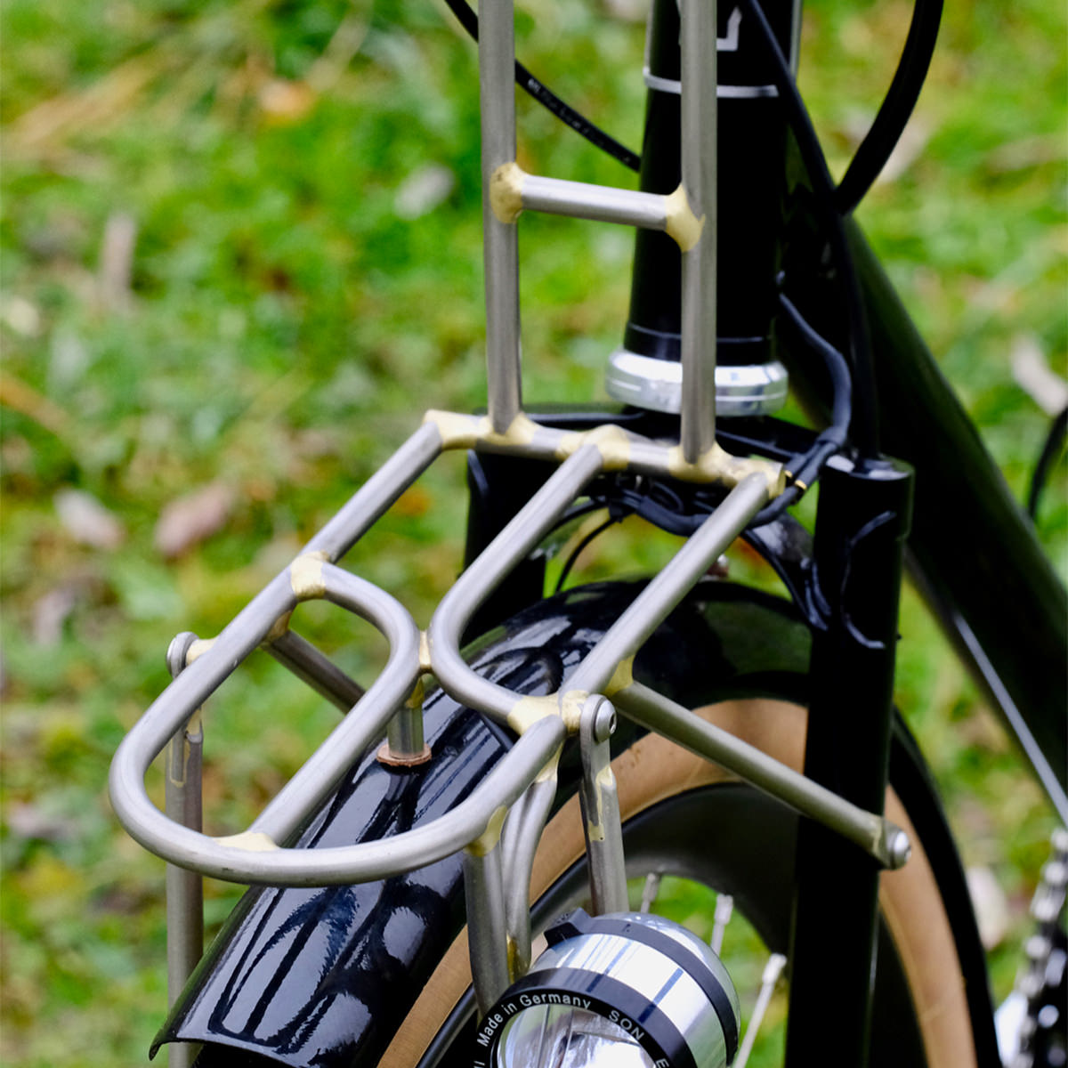 The fillet-brazed frame exhibits Victoire’s expertise in building exceptional tourers in the style of the French constructeur. A blend of old and new, it includes a custom stem and front rack, White Industries and Campagnolo components, and SON lighting.