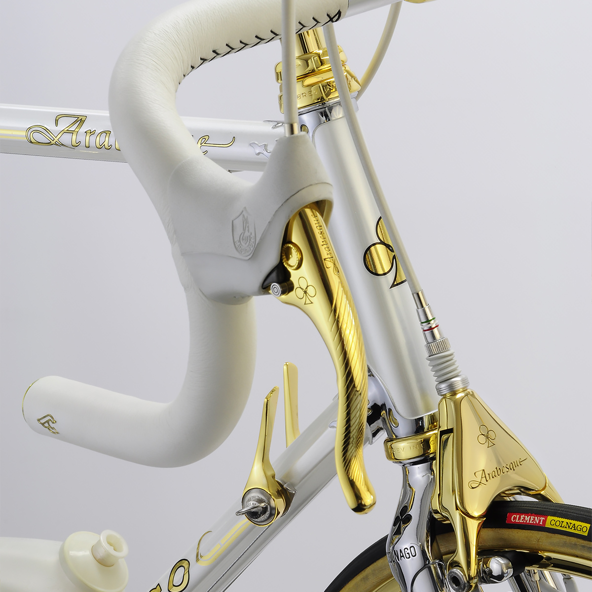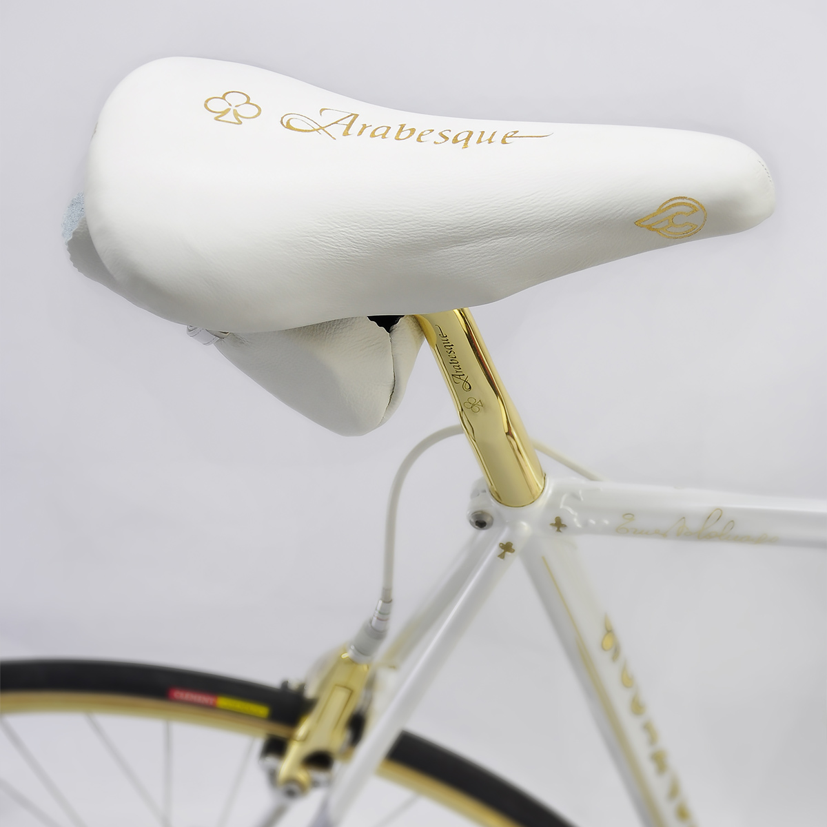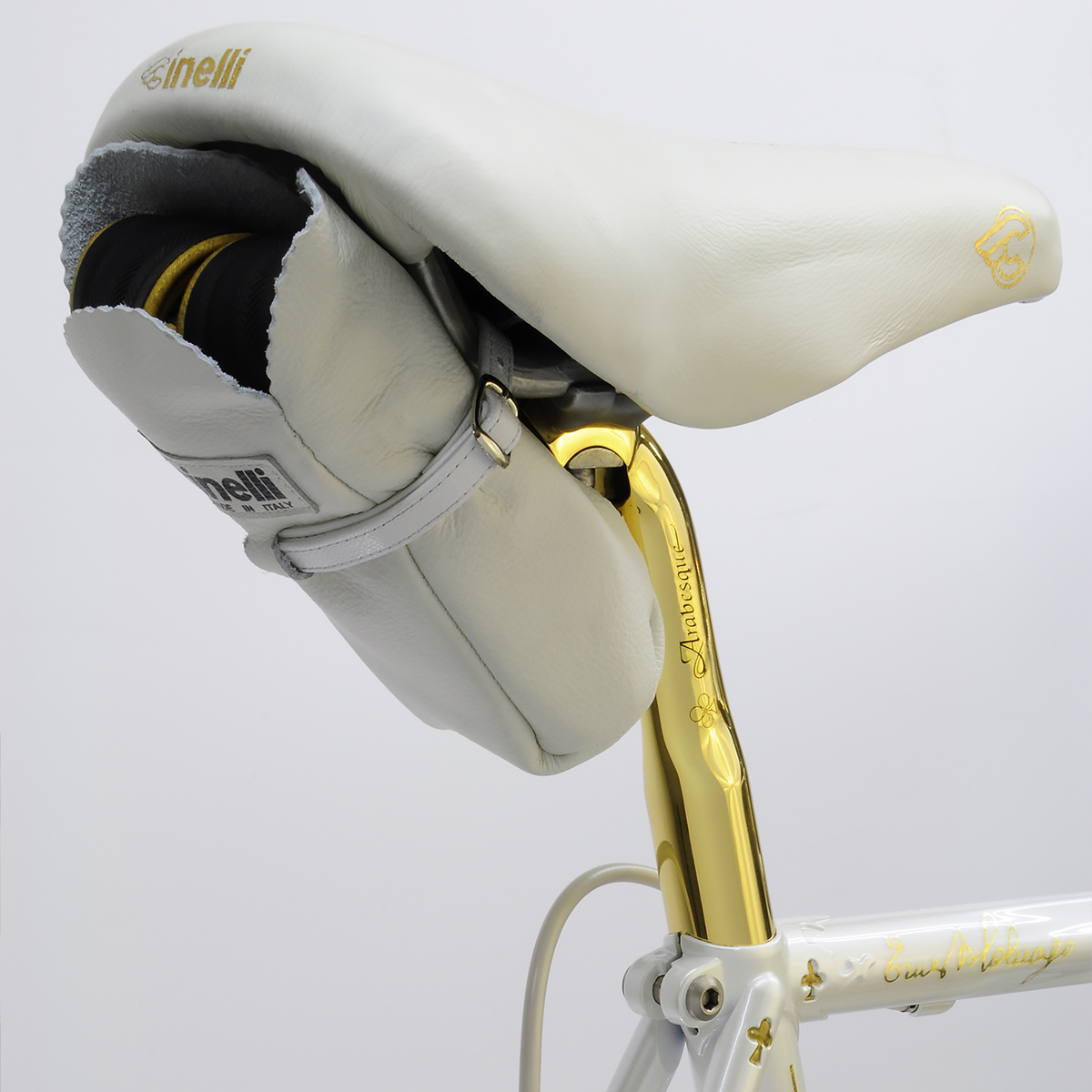 When André requested Javier to apply his treatment to his Arabesque, no punches were pulled: it now sports a 24k Campagnolo C-Record gruppo with Strada rims and white Cinelli VIP upholstery.