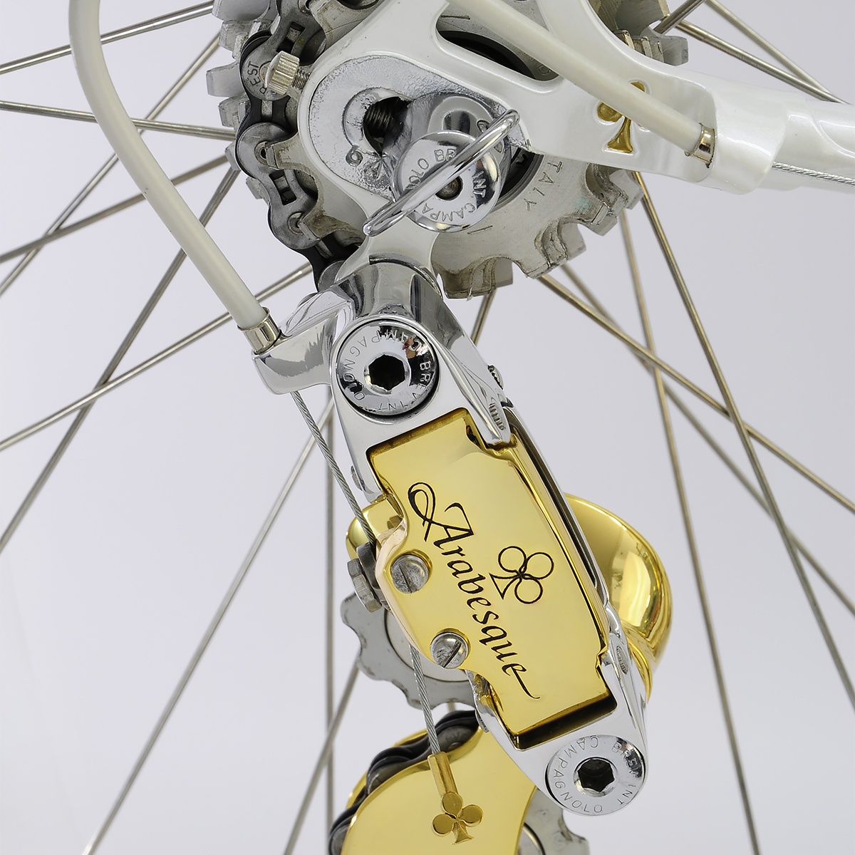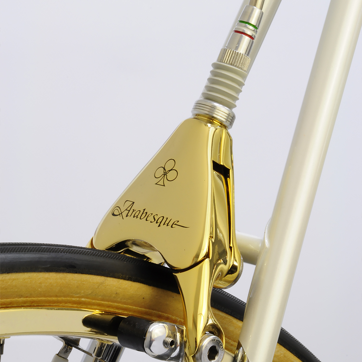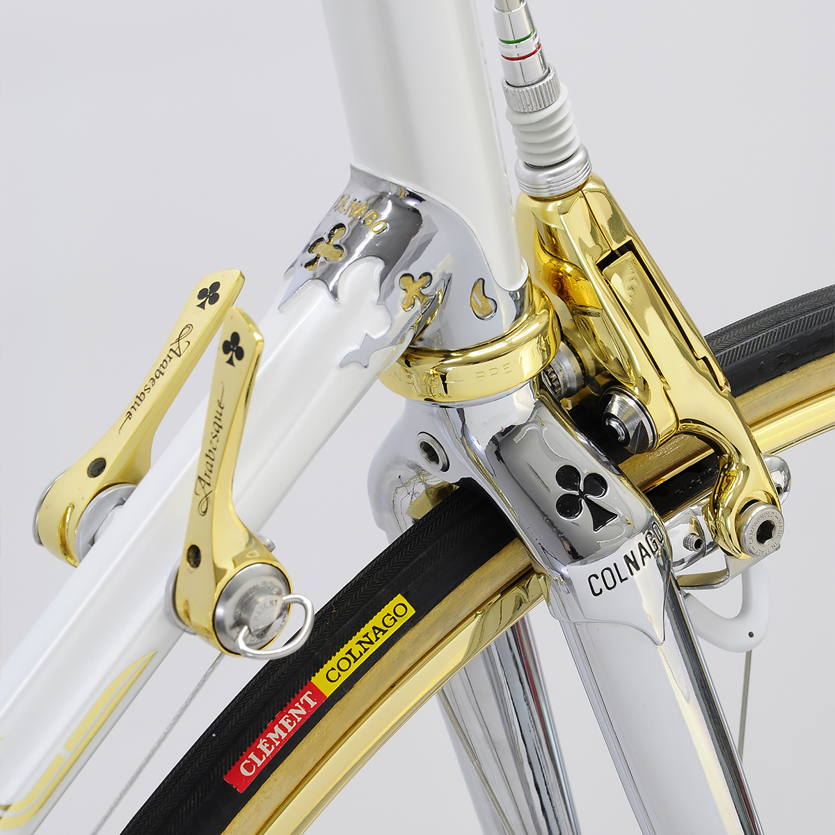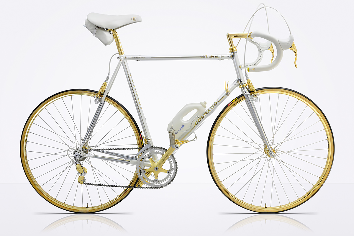 When André requested Javier to apply his treatment to his Arabesque, no punches were pulled: it now sports a 24k Campagnolo C-Record gruppo with Strada rims and white Cinelli VIP upholstery.