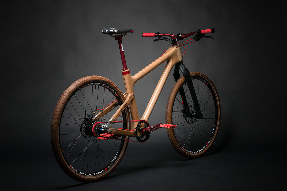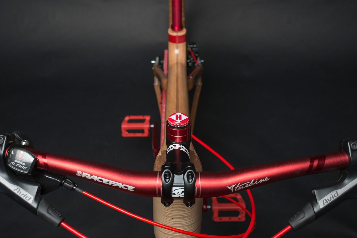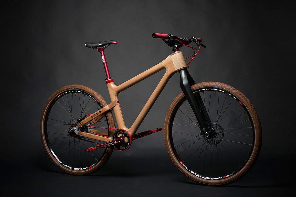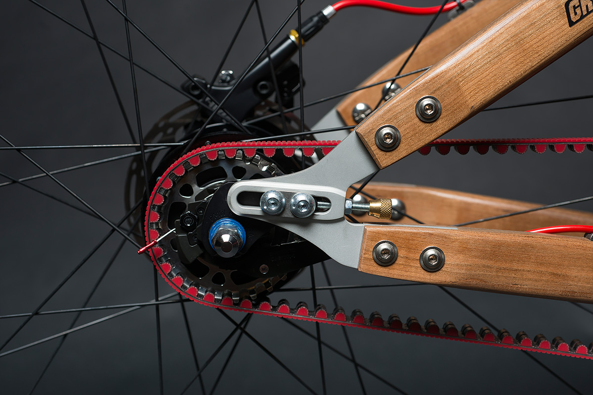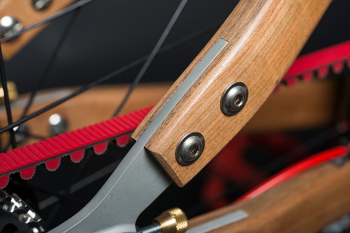 The item that this wooden bike was designed around was the red belt drive. I wanted to have red accents, which also lent itself to using cherry. As far as the Shimano Alfine 8, my original builds were all single speeds and this allowed for a more enjoyable cruising experience without sacrificing the aesthetic simplicity of the belt.